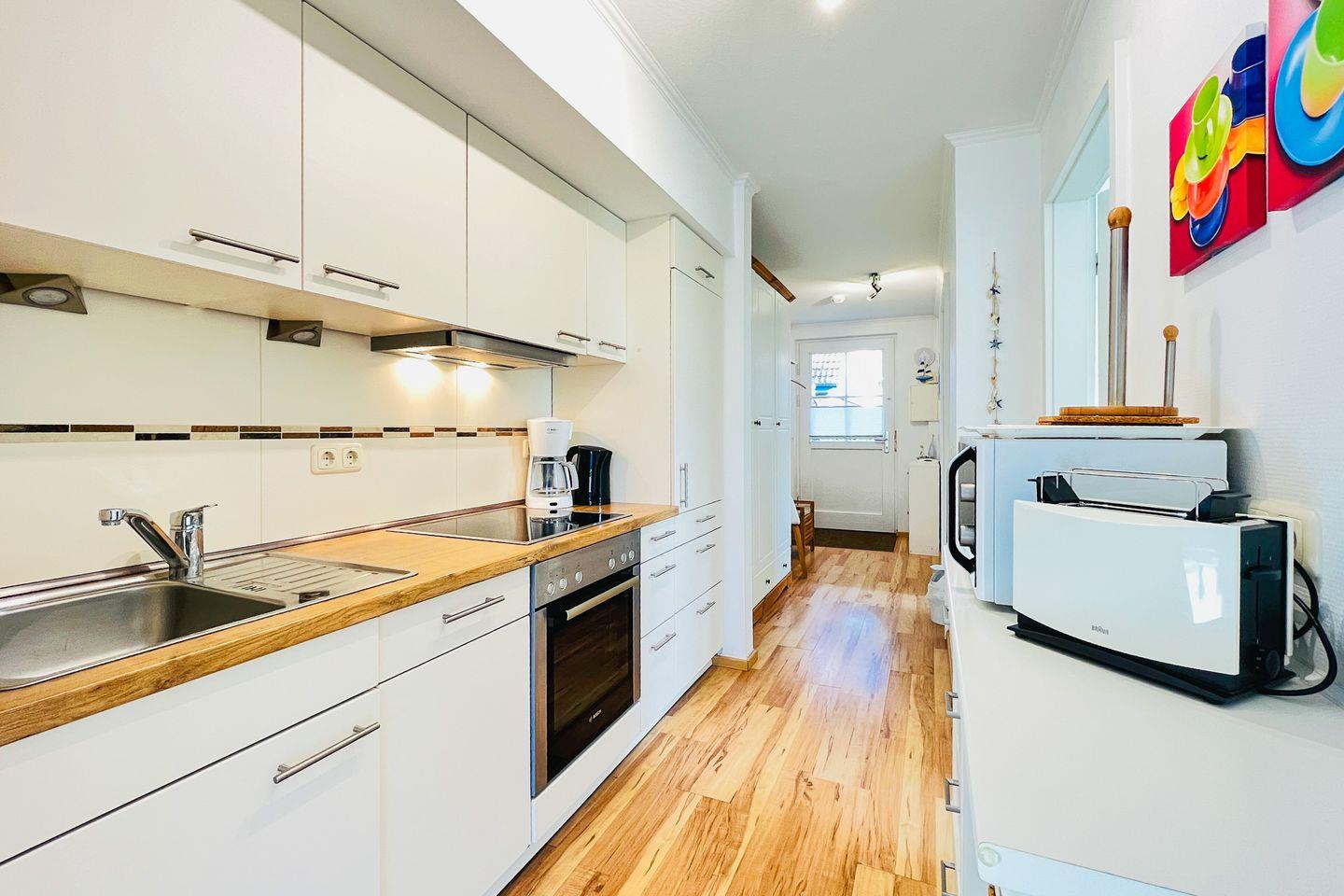 Die integrierte Küchenzeile ist neben einem 4-Platten-Cerankochfeld, Backofen, Geschirrspüler und Kühlschrank mit Gefrierfach zusätzlich mit einem Eierkocher, Wasserkocher, Mikrowelle, Toaster, Handmixer sowie den nötigen Utensilien für die Zubereitung der Mahlzeiten reichlich und gut ausgestattet. Als Bodenbelag wurde in der ganzen Wohnung Laminat verlegt.