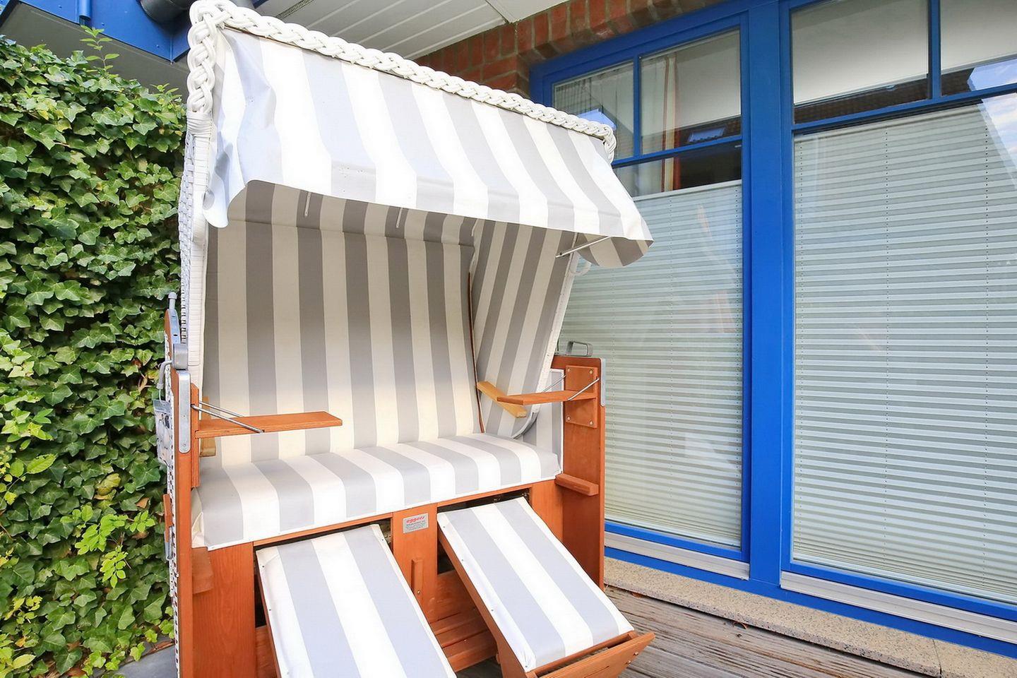 Vom Wohnzimmer aus betrittst du die möblierte und überdachte Terrasse. Ein Strandkorb und eine Sonnenliege laden zum Verweilen ein. Im hellen Wohnbereich erwartet dich eine Doppelschlafcouch (150 x 200 cm). Für Kurzweil sorgen ein Flatscreen-TV sowie eine Stereo-Anlage, ein DVD-Player, Bücher und Gesellschaftsspiele.