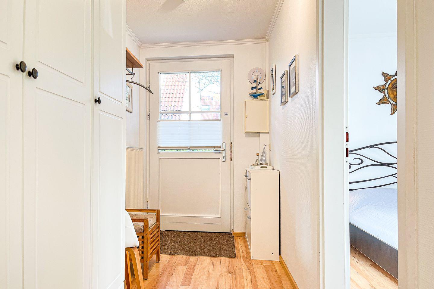 Im Schlafzimmer erwarten dich ein Doppelbett (2 x 80 x 200 cm) mit Ablagen rechts und links sowie und ein Kleiderschrank. Auf dem Flur findest du einen großen Kleiderschrank für dein übriges Reisegepäck. Plissees sowie zusätzlich Verdunklungsmöglichkeiten durch Vorhänge sind in der ganzen Wohnung vorhanden. Insektenschutz ist überwiegend vorhanden.