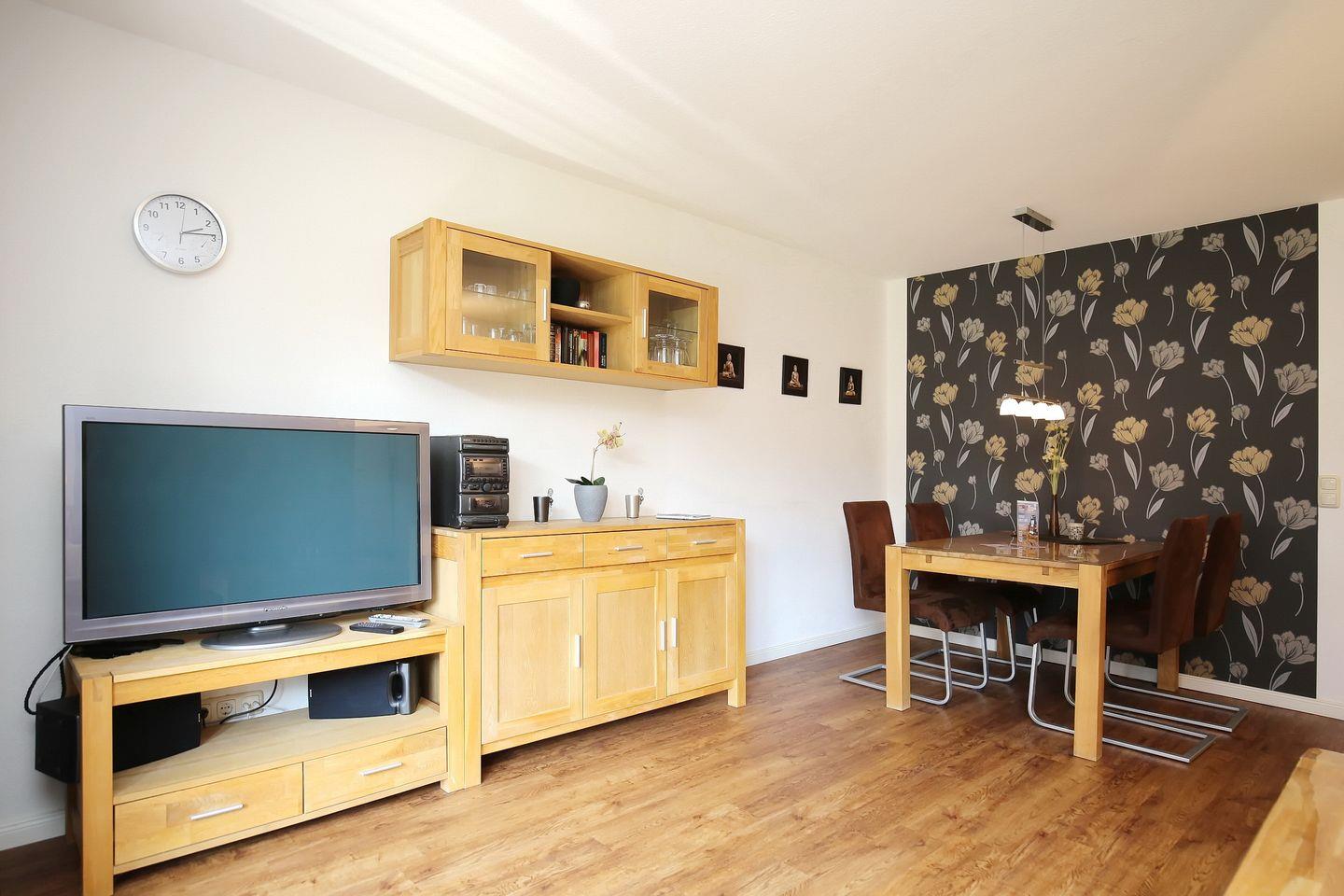Genieße die Sonne im eigenen Strandkorb auf der möblierten Terrasse. Von hieraus gelangst du in den Wohn- und Essbereich. Ein Schlafsofa (160 x 200 cm) dient als bequeme Schlafmöglichkeit für zwei Personen. Für die Unterhaltung sorgen ein TV-Flatscreen und eine Stereoanlage. In der gesamten Wohnung sorgt der Design-Bodenbelag für ein gemütliches Ambiente.