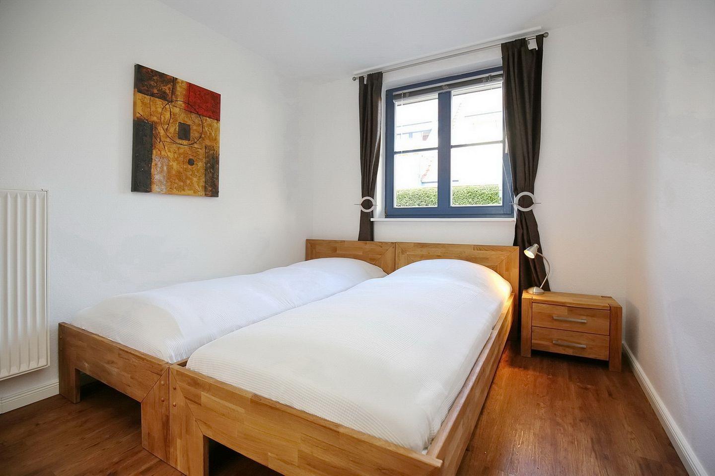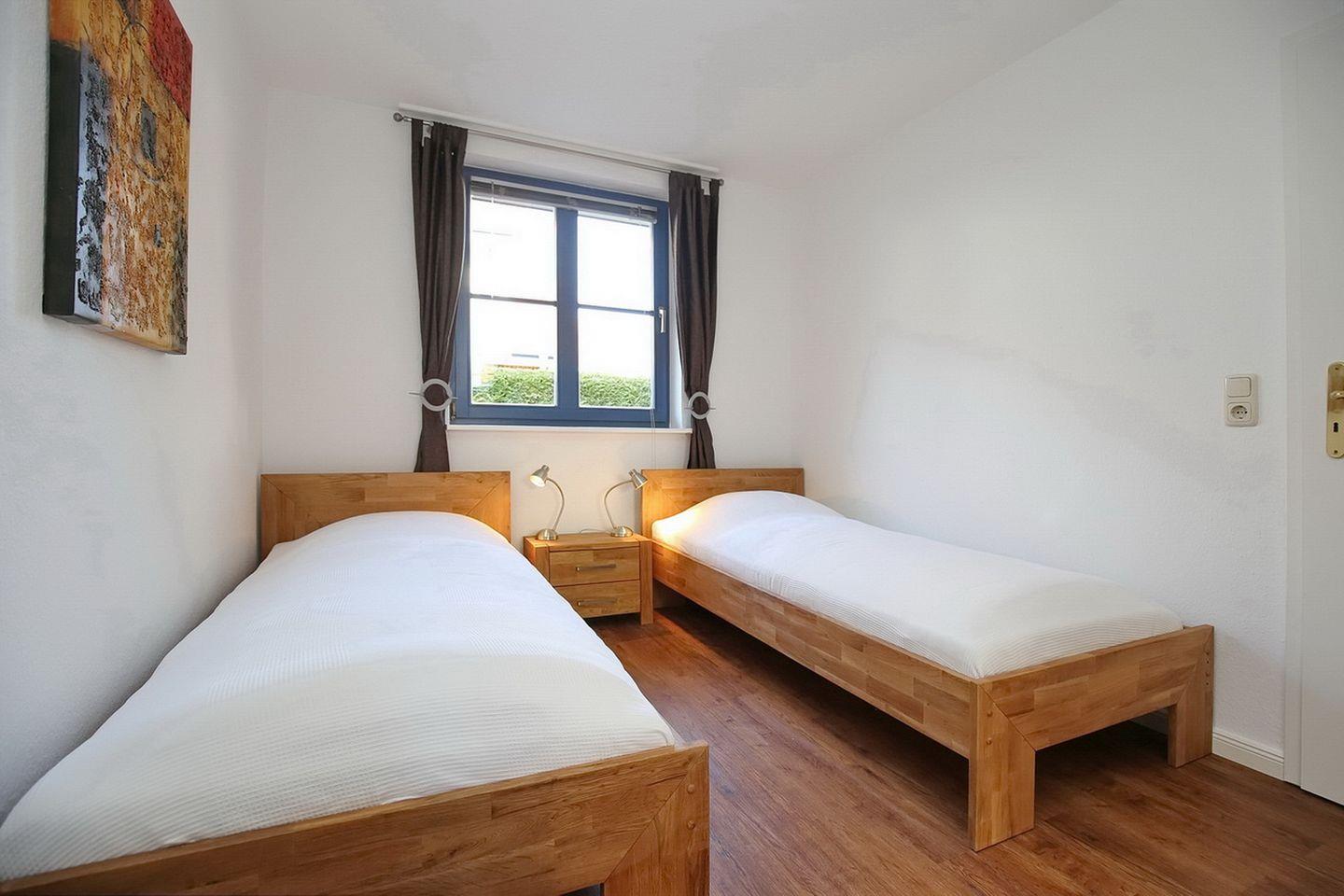 Im separaten Schlafzimmer stehen zwei gemütliche Einzelbetten (90 x 200 cm), diese können zusammen geschoben werden und ein geräumiger Kleiderschrank. Am Fenster befinden sich zur Abdunkelung Vorhänge und eine Jalousie. Für die kleinen Gäste stehen ein Kinderreisebett (ohne Matratze) und Hochstuhl bereit.