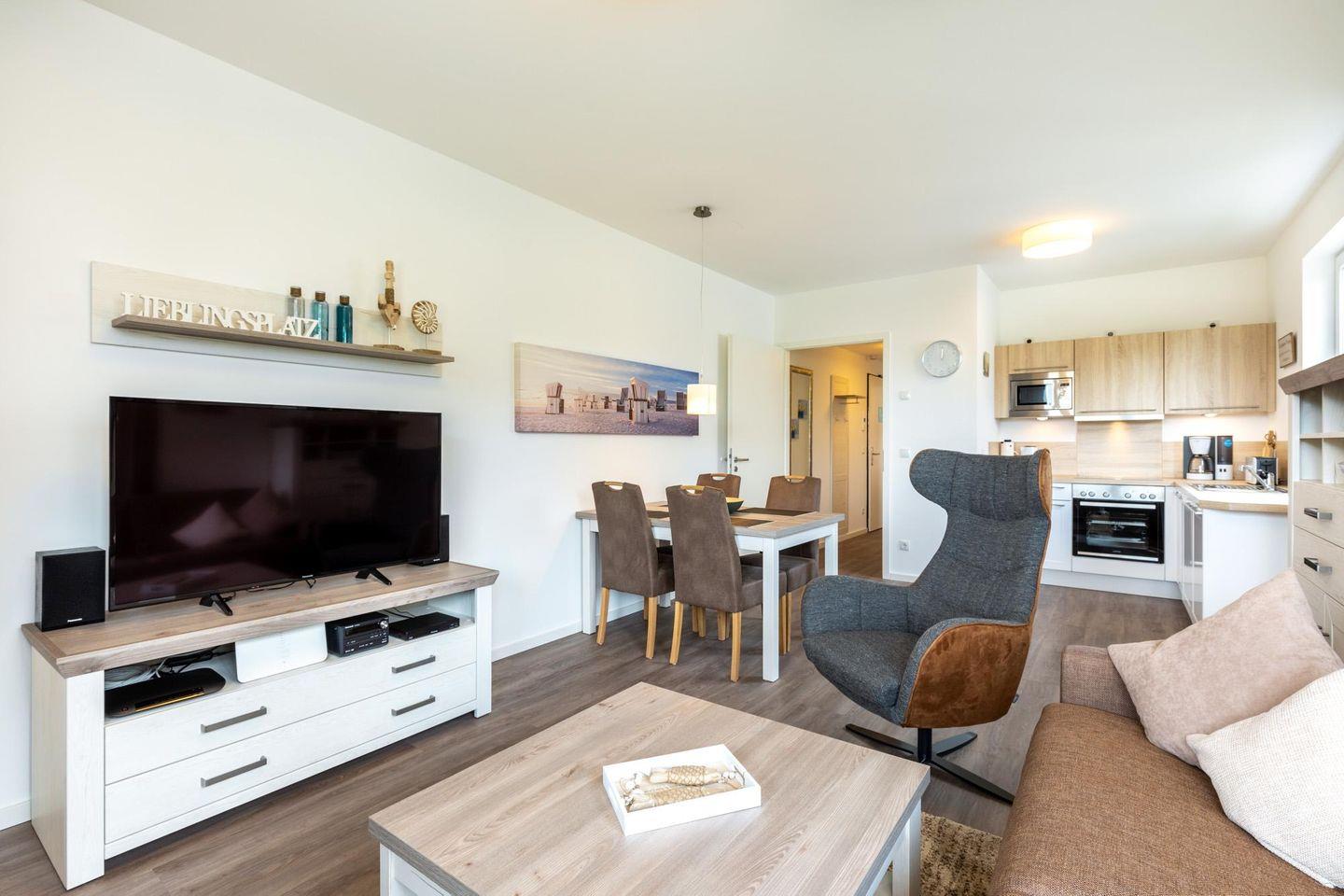 Das helle und moderne Nichtraucher-Apartment verfügt über Fußbodenheizung, bodentiefe Fenster mit 3-fach Isolierung, kostenfreies WLAN und eine voll ausgestattete offene Küche mit Geschirrspüler, Gefrierfach, Kaffeemaschine, Toaster, Wasserkocher, Backofen und Mikrowelle sowie über einen Essbereich. Im Wohnbereich befindet sich eine Doppelschlafcouch (1,60 x 2,00 m) und ein großer Flatscreen-TV mit Blu-ray-Player. Das separate Schlafzimmer ist mit einem modernen Boxspringbett (1,80 x 2,00 m) und einem Flatscreen-TV ausgestattet. Ein Kinderbett kann gegen Entgelt im Wohnbereich aufgestellt werden und auf Wunsch könnt ihr einen Kinderhochstuhl hinzubuchen. Im stilvollen Badezimmer befinden sich eine ebenerdige Dusche, ein Waschtisch mit Föhn, Kosmetikspiegel und Handtuchheizkörper. Das Apartment verfügt über einen Flur mit Garderobe. Nach einem erholsamen Urlaubstag lässt es sich auf dem mit Gartenmöbeln und Sonnenschirm ausgestatteten und sonnigen Balkon, herrlich entspannen. Der Balkon ist vom Wohnzimmer aus begehbar.