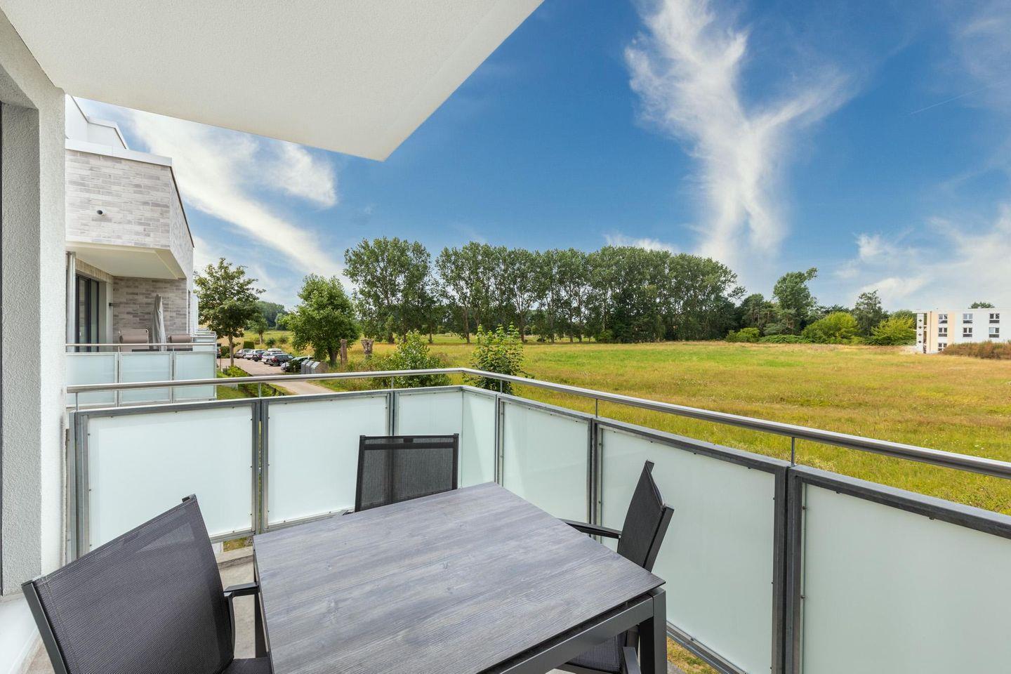 Modernes, strandnahes Apartment für zwei Personen mit sonnigem Balkon und Blick ins Grüne.
