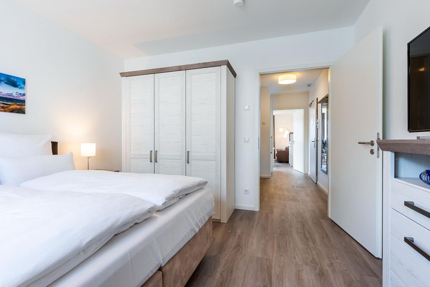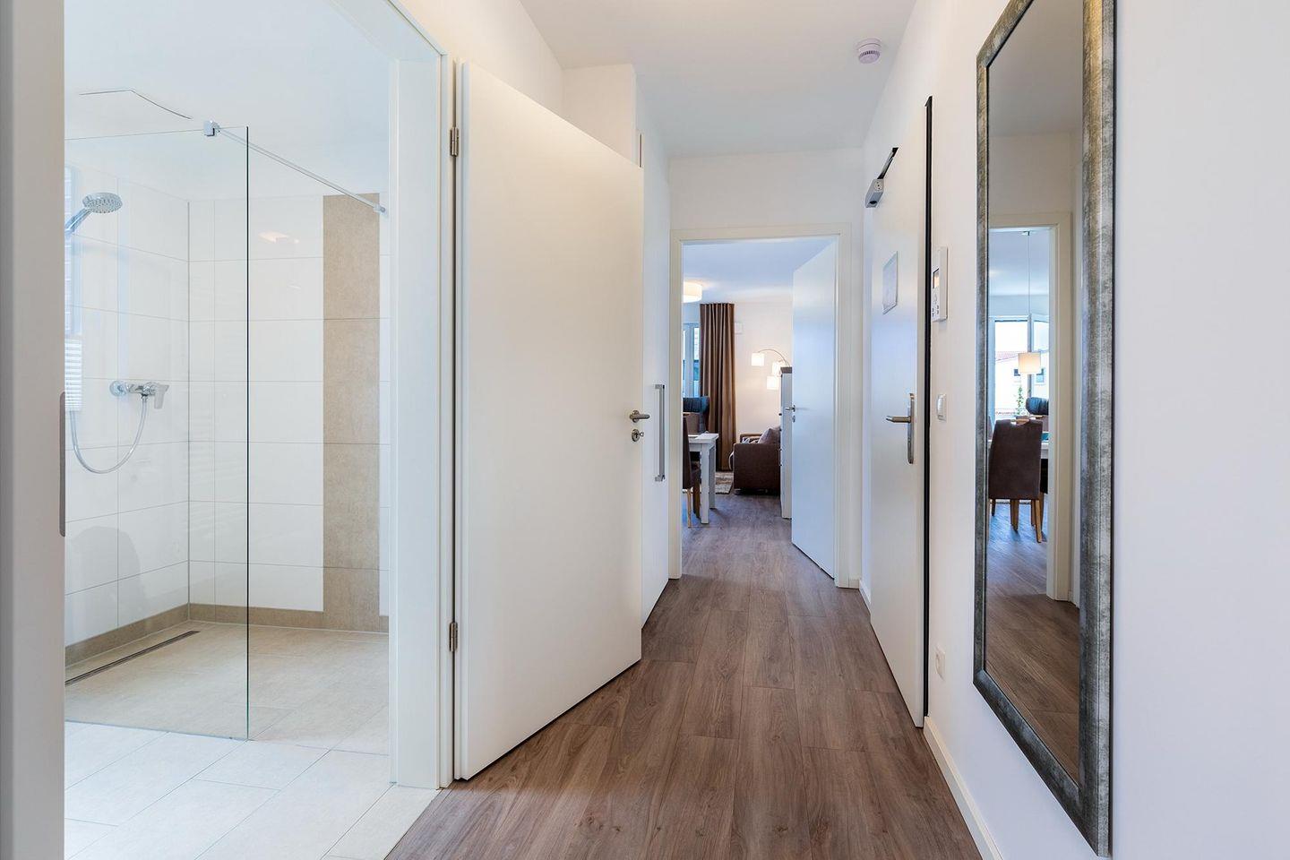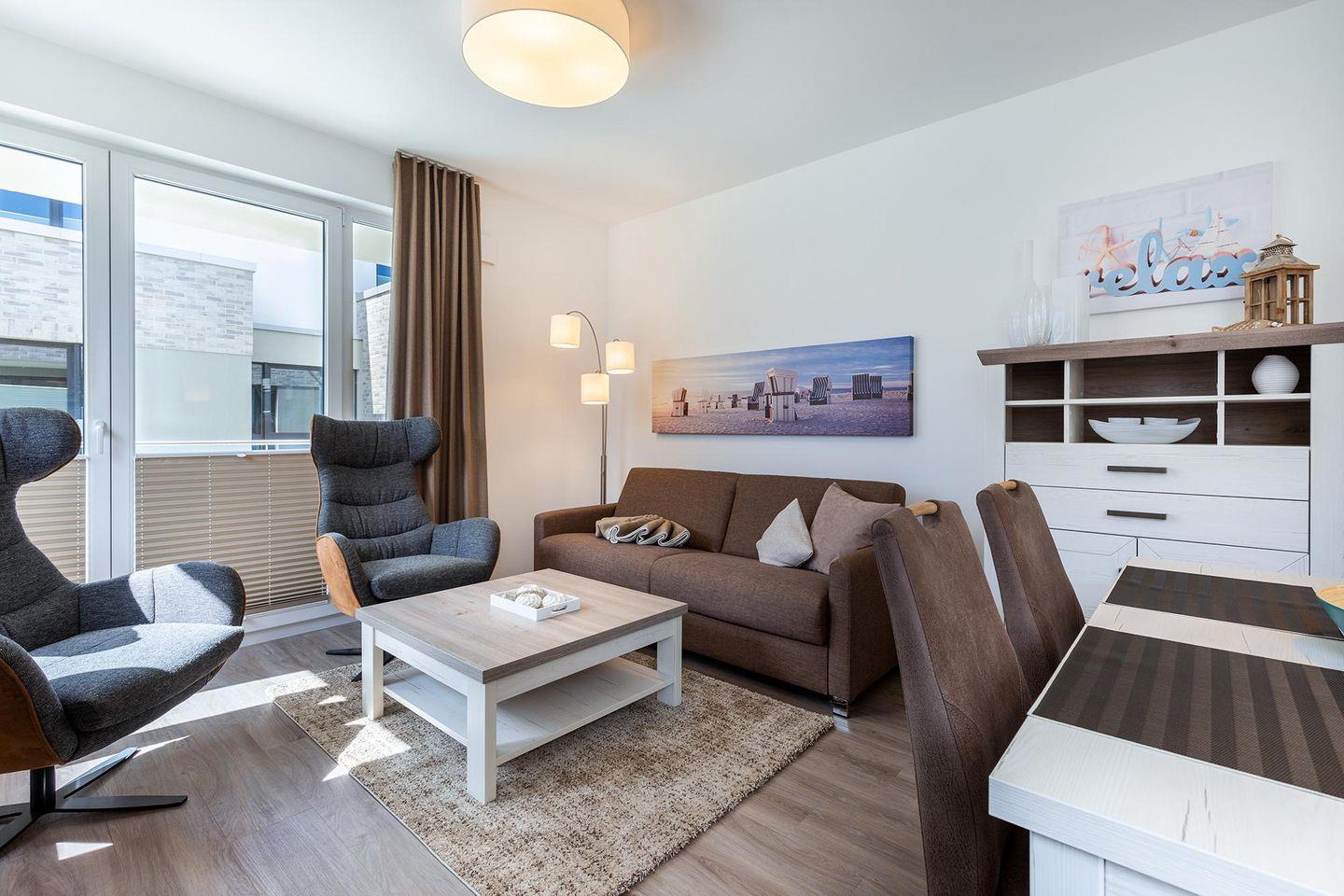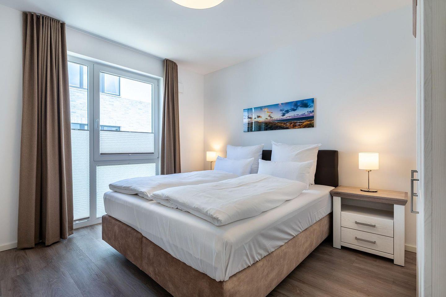Das helle und moderne Nichtraucher-Apartment verfügt über Fußbodenheizung, bodentiefe Fenster mit 3-fach Isolierung, kostenfreies WLAN und eine voll ausgestattete offene Küche mit Geschirrspüler, Gefrierfach, Kaffeemaschine, Toaster, Wasserkocher, Backofen und Mikrowelle sowie über einen Essbereich. Im Wohnbereich befindet sich eine Doppelschlafcouch (1,60 x 2,00 m) und ein großer Flatscreen-TV mit Blu-ray-Player. Das separate Schlafzimmer ist mit einem modernen Boxspringbett (1,80 x 2,00 m) und einem Flatscreen-TV ausgestattet. Ein Kinderbett kann gegen Entgelt aufgestellt werden und auf Wunsch könnt ihr einen Kinderhochstuhl hinzubuchen. Im stilvollen Badezimmer befinden sich eine ebenerdige Dusche, ein Waschtisch mit Föhn, Kosmetikspiegel und Handtuchheizkörper. Das Apartment verfügt über einen Flur mit Garderobe. Auf dem mit Gartenmöbeln und Sonnenschirm ausgestatteten Balkon könnt ihr den ganzen Tag die Sonne genießen. Der Balkon ist vom Wohnzimmer aus begehbar. Bis auf eine Schwelle zum Balkon, ist das Apartment barrierefrei konzipiert.