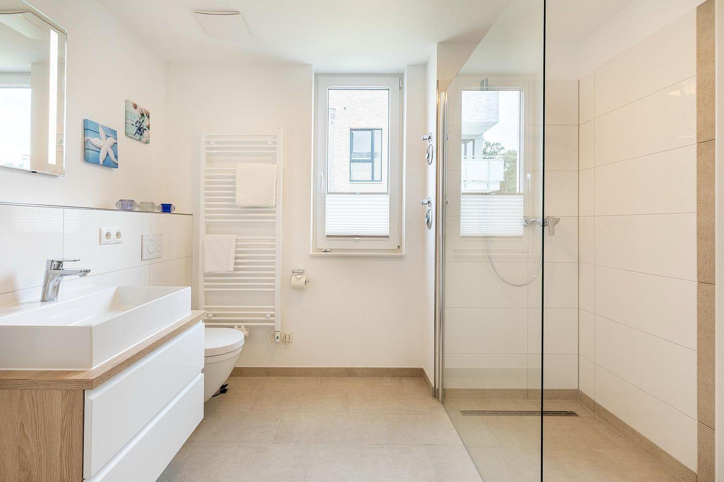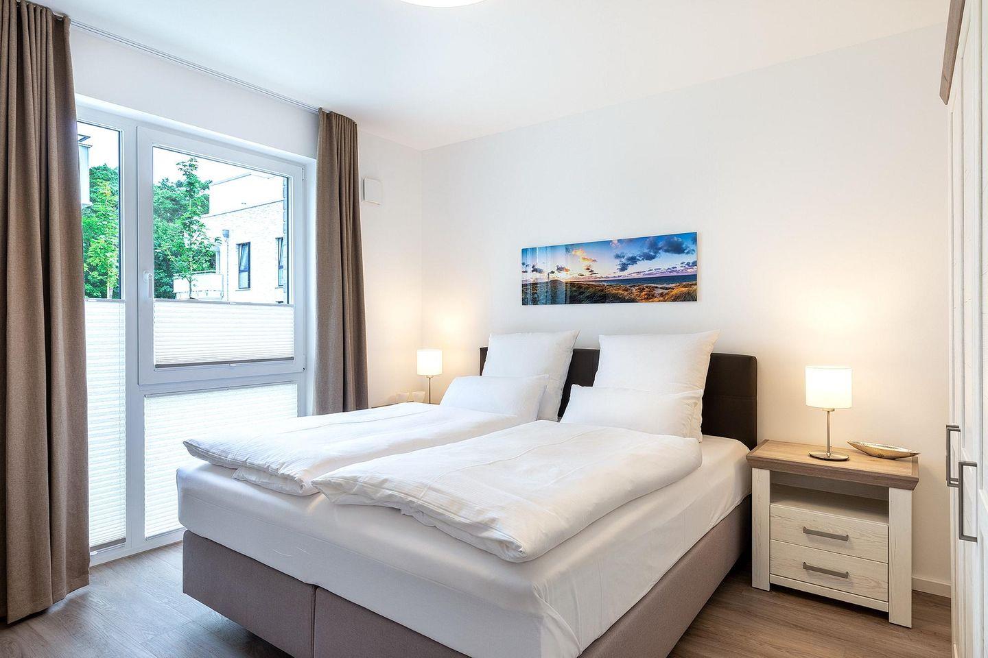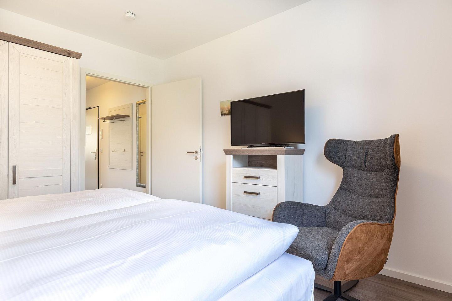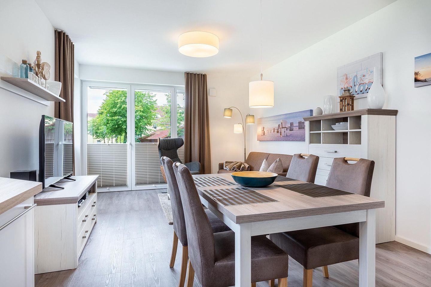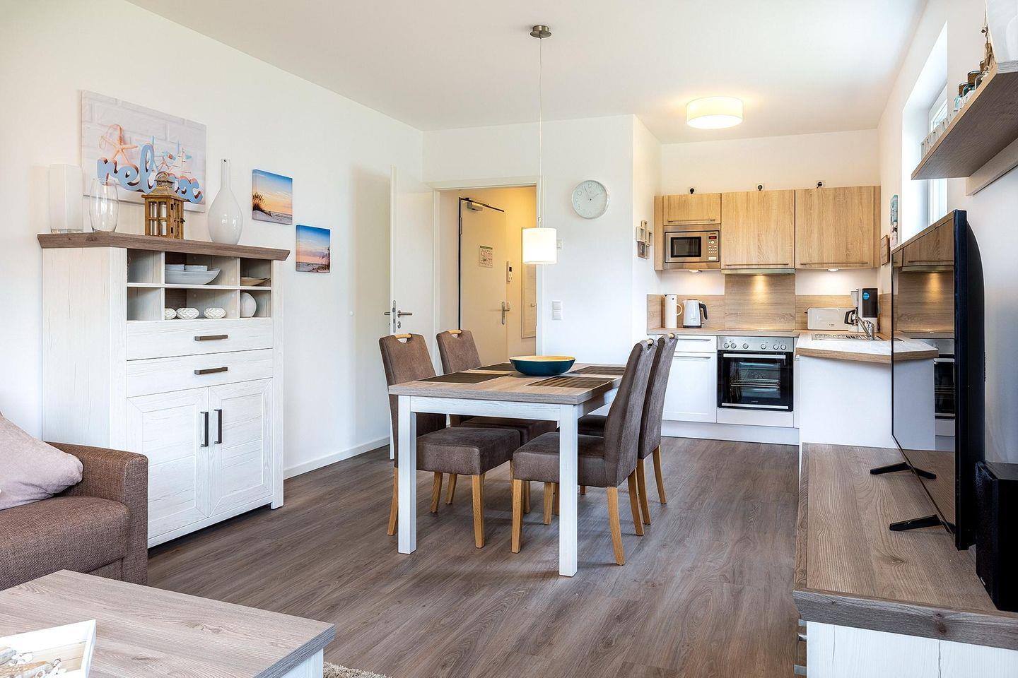 Das familienfreundliche und moderne Nichtraucher-Apartment verfügt über Fußbodenheizung, bodentiefe Fenster mit 3-fach Isolierung, kostenfreies WLAN und eine voll ausgestattete offene Küche mit Geschirrspüler, Gefrierfach, Kaffeemaschine, Toaster, Wasserkocher, Backofen und Mikrowelle sowie über einen Essbereich. Im Wohnbereich befindet sich eine Doppelschlafcouch (1,60 x 2,00 m) und ein großer Flatscreen-TV mit Blu-ray-Player. Das separate Schlafzimmer ist mit einem modernen Boxspringbett (1,80 x 2,00 m) und einem Flatscreen-TV ausgestattet. Ein Kinderbett kann gegen Entgelt aufgestellt werden und auf Wunsch könnt ihr einen Kinderhochstuhl hinzubuchen. Im stilvollen Badezimmer befinden sich eine ebenerdige Dusche, ein Waschtisch mit Föhn, Kosmetikspiegel und Handtuchheizkörper. Das Apartment verfügt über einen Flur mit Garderobe. Nach einem erholsamen Urlaubstag lässt es sich auf der mit Gartenmöbeln und Sonnenschirm ausgestatteten und sonnigen Terrasse, herrlich entspannen. Die Terrasse ist vom Wohnzimmer aus begehbar.