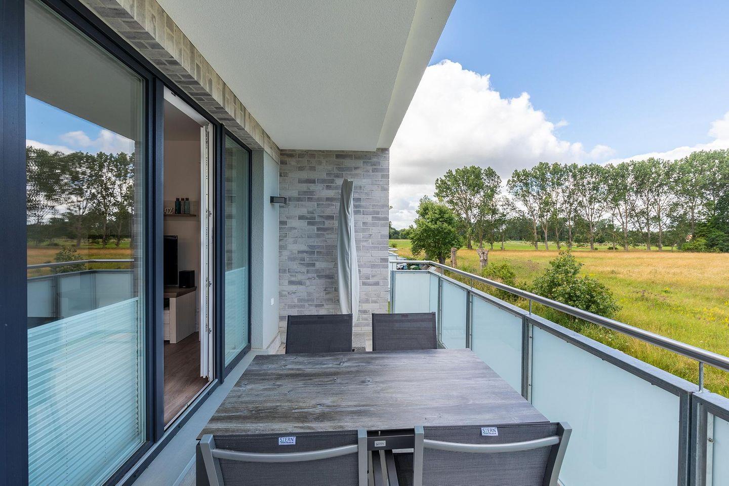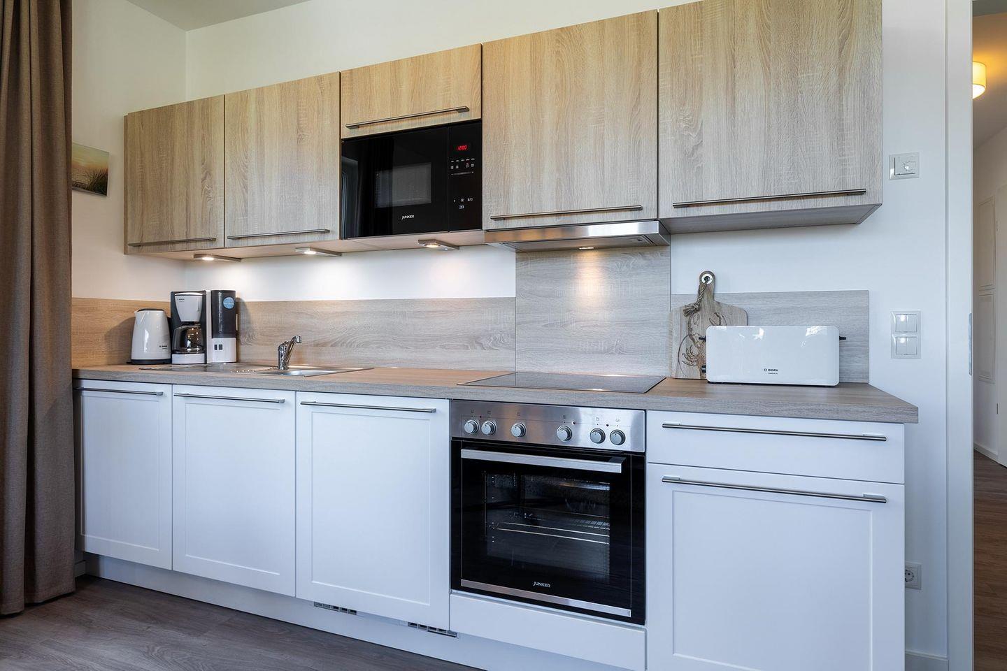 Das helle und moderne Nichtraucher-Apartment verfügt über Fußbodenheizung, bodentiefe Fenster mit 3-fach Isolierung, kostenfreies WLAN und eine voll ausgestattete offene Küche mit Geschirrspüler, Gefrierfach, Kaffeemaschine, Toaster, Wasserkocher, Backofen und Mikrowelle sowie über einen Essbereich. Im Wohnbereich befindet sich eine Doppelschlafcouch (1,60 x 2,00 m) und ein großer Flatscreen-TV mit Blu-ray-Player. Das separate Schlafzimmer ist mit einem modernen Boxspringbett (1,80 x 2,00 m) und einem Flatscreen-TV ausgestattet. Ein Kinderbett kann gegen Entgelt im Wohnbereich aufgestellt werden und auf Wunsch könnt ihr einen Kinderhochstuhl hinzubuchen. Im stilvollen Badezimmer befinden sich eine ebenerdige Dusche, ein Waschtisch mit Föhn, Kosmetikspiegel und Handtuchheizkörper. Das Apartment verfügt über einen Flur mit Garderobe. Auf dem mit Gartenmöbeln und Sonnenschirm ausgestatteten Balkon könnt ihr nach Lust und Laune die Sonne genießen, die hier bis in den Abend scheint. Der Balkon ist vom Wohnbereich aus begehbar. Bis auf eine Schwelle zum Balkon, ist das Apartment barrierefrei konzipiert.