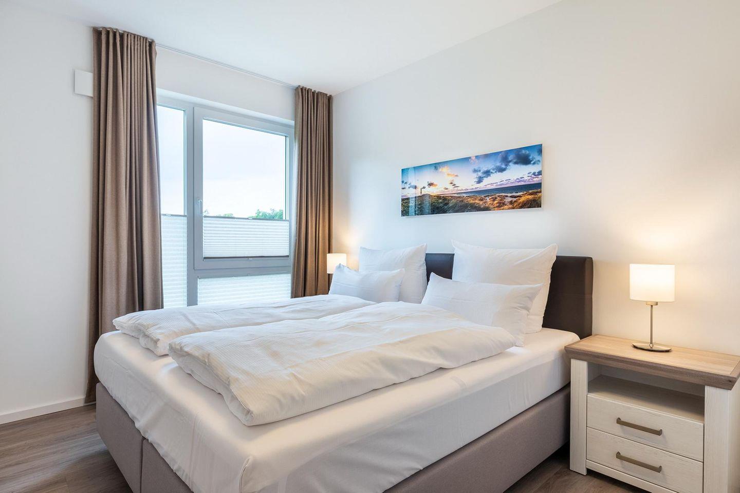Das helle und moderne Nichtraucher-Apartment verfügt über Fußbodenheizung, bodentiefe Fenster mit 3-fach Isolierung, kostenfreies WLAN und eine voll ausgestattete offene Küche mit Geschirrspüler, Gefrierfach, Kaffeemaschine, Toaster, Wasserkocher, Backofen und Mikrowelle sowie über einen Essbereich. Im Wohnbereich befindet sich eine Doppelschlafcouch (1,60 x 2,00 m) und ein großer Flatscreen-TV. Das separate Schlafzimmer ist mit einem modernen Boxspringbett (1,80 x 2,00 m) und einem Flatscreen-TV ausgestattet. Ein Kinderbett kann gegen Entgelt aufgestellt werden und auf Wunsch könnt ihr einen Kinderhochstuhl hinzubuchen. Im stilvollen Badezimmer befinden sich eine ebenerdige Dusche, ein Waschtisch mit Föhn, Kosmetikspiegel und Handtuchheizkörper. Das Apartment verfügt über einen Flur mit Garderobe. Auf dem mit Gartenmöbeln und Sonnenschirm ausgestatteten West-Balkon mit Landblick könnt ihr die Sonne genießen, die hier bis in den Abend scheint. Der Balkon ist vom Wohnbereich aus begehbar. Bis auf eine Schwelle zum Balkon ist das Apartment barrierefrei konzipiert.