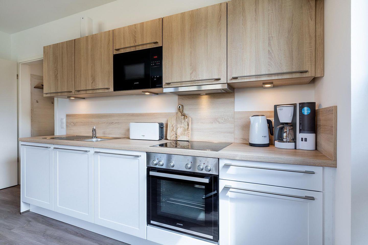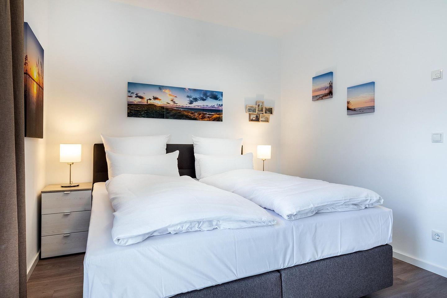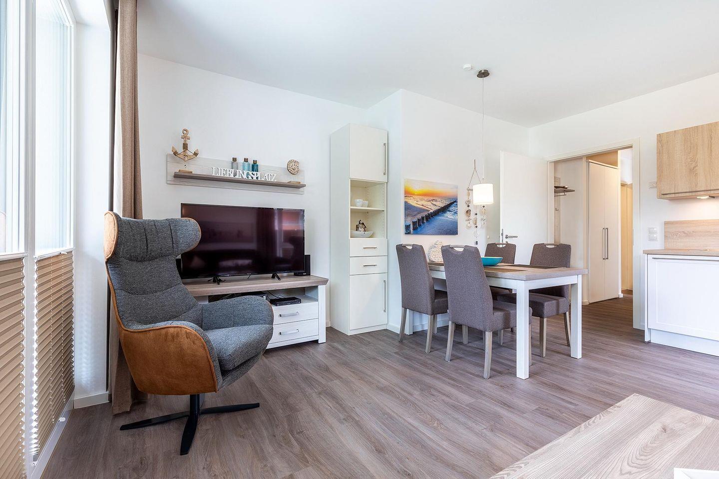 Das helle und moderne Nichtraucher-Apartment verfügt über Fußbodenheizung, bodentiefe Fenster mit 3-fach Isolierung, kostenfreies WLAN und eine voll ausgestattete offene Küche mit Geschirrspüler, Gefrierfach, Kaffeemaschine, Toaster, Wasserkocher, Backofen und Mikrowelle sowie über einen Essbereich. Im Wohnbereich befindet sich eine Doppelschlafcouch (1,60 x 2,00 m) und ein großer Flatscreen-TV mit Blu-ray-Player. Das separate Schlafzimmer ist mit einem modernen Boxspringbett (1,80 x 2,00 m) und einem Flatscreen-TV ausgestattet. Ein Kinderbett kann gegen Entgelt aufgestellt werden und auf Wunsch könnt ihr einen Kinderhochstuhl hinzubuchen. Im stilvollen Badezimmer befinden sich eine ebenerdige Dusche, ein Waschtisch mit Föhn, Kosmetikspiegel und Handtuchheizkörper. Das Apartment verfügt über einen Flur mit Garderobe. Auf dem mit Gartenmöbeln und Sonnenschirm ausgestatteten Balkon könnt ihr den ganzen Tag die Sonne genießen. Der Balkon ist vom Wohnzimmer aus begehbar. Bis auf eine Schwelle zum Balkon ist das Apartment barrierefrei konzipiert.
