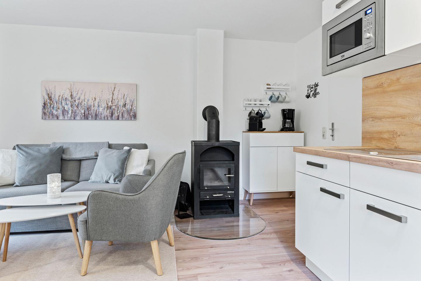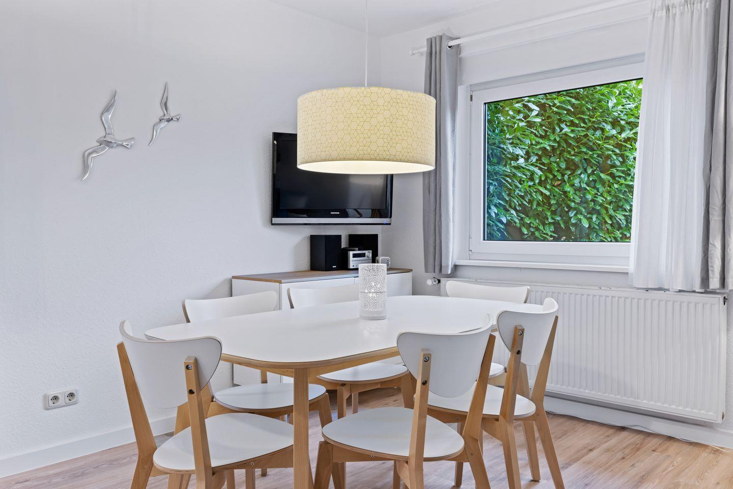 Die helle und freundliche Nichtraucher-Ferienunterkunft verfügt über kostenfreies WLAN, ist mit Laminatböden ausgestattet und beinhaltet zwei separate Schlafzimmer. Eines der Schlafzimmer befindet sich im Obergeschoss mit angeschlossenem Badezimmer und beinhaltet ein Doppelbett (1,80 x 2,00 m), das zweite Schlafzimmer verfügt über ein Etagenbett und ein Einzelbett und liegt im Erdgeschoss. Der behagliche Wohnbereich ist mit Schlafcouch und Kaminofen (Kaminholz ist nicht inbegriffen) ausgestattet. Auf der westlich gelegenen Terrasse - ausgestattet mit Gartenmöbeln für 6 Personen, Sonnenliegen und Sonnenschirm - genießt ihr den Blick in die Natur und das Meeresklima der nahen Ostsee.