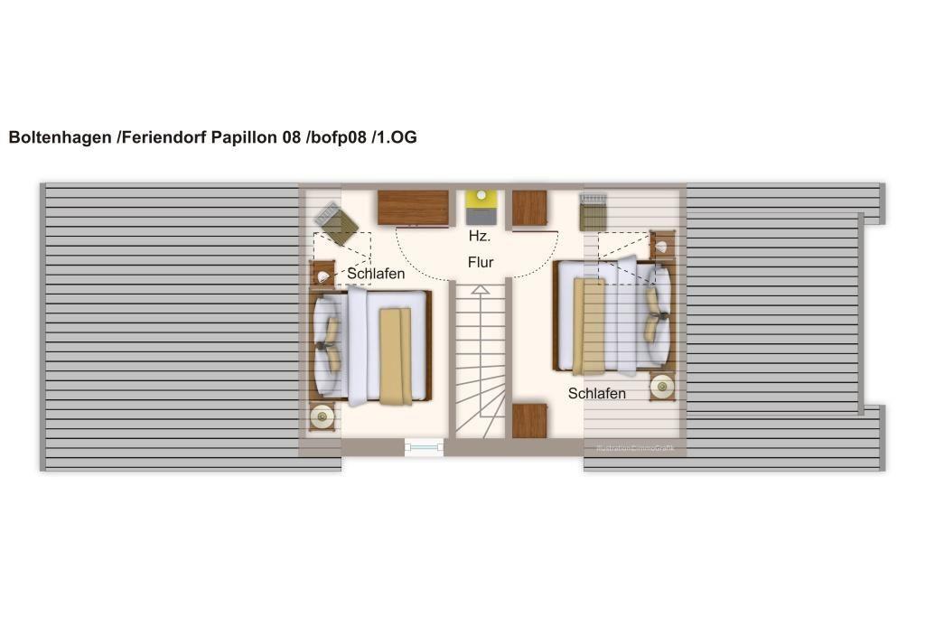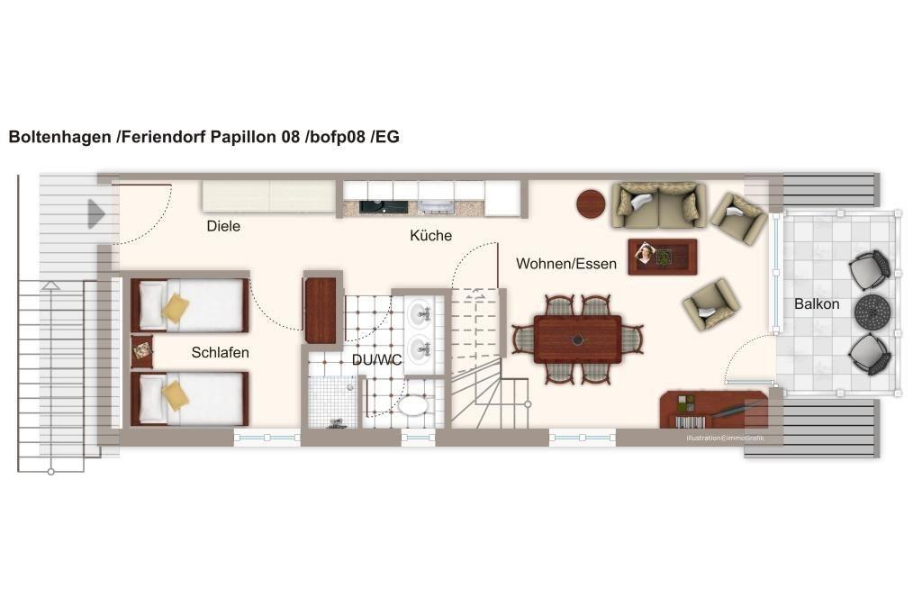 Das Feriendorf Papillon ist nur 250 m vom Sandstrand entfernt. In der parkähnlichen Anlage an der Ostsee findet ihr unsere 68 qm große 4-Zimmer-Maisonettewohnung, die bis zu 6 Personen beherbergen kann.