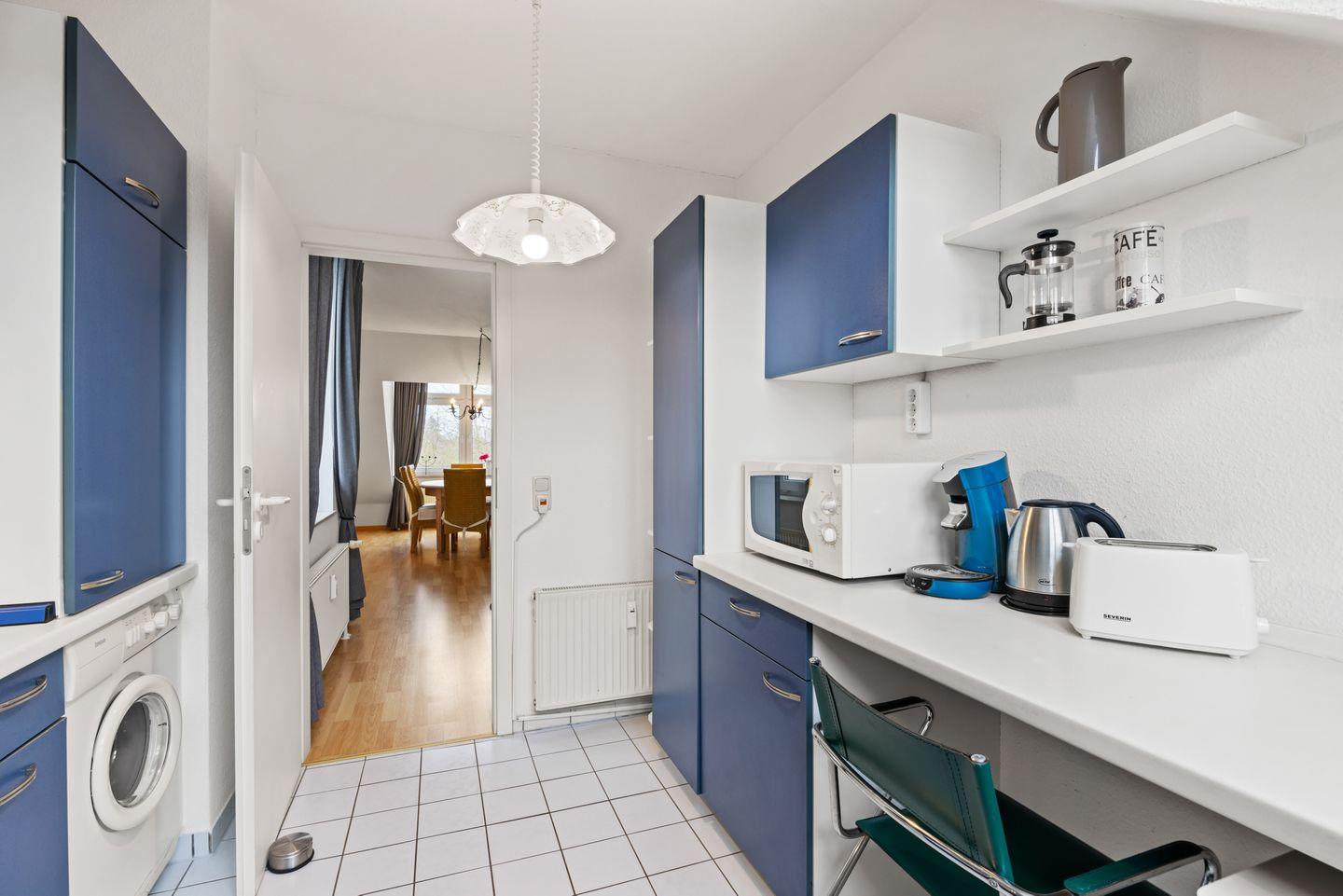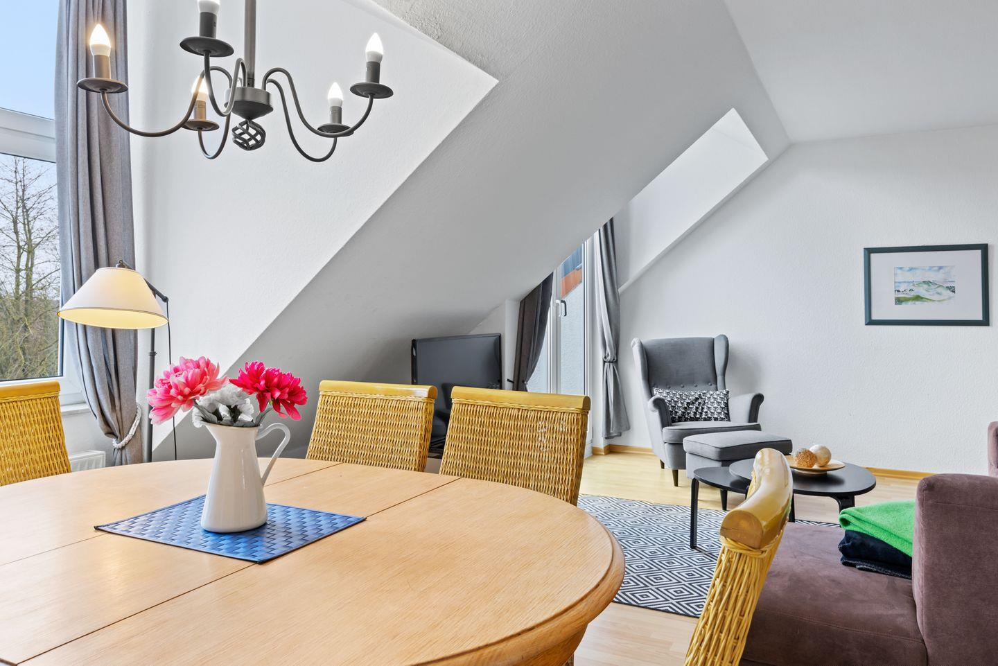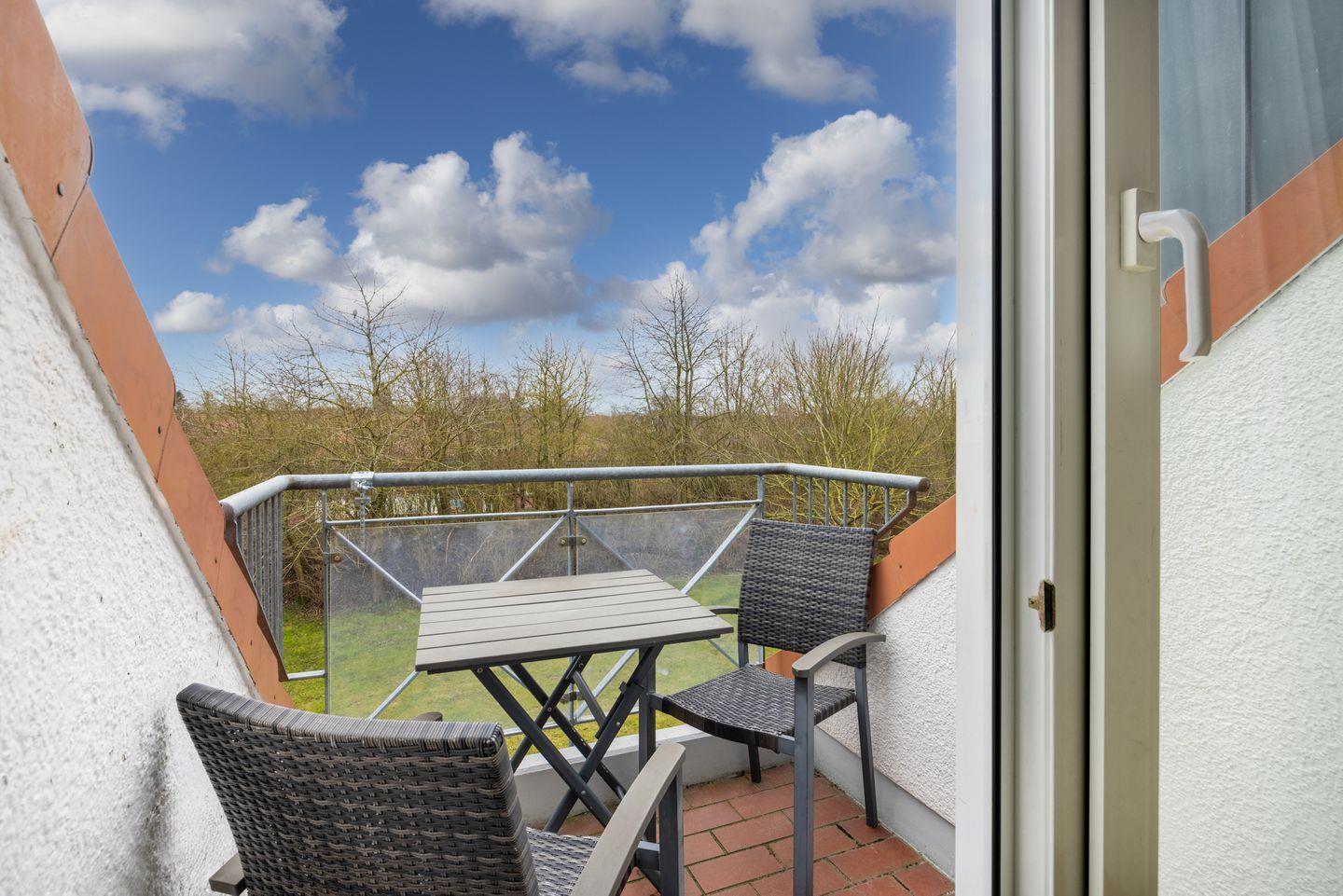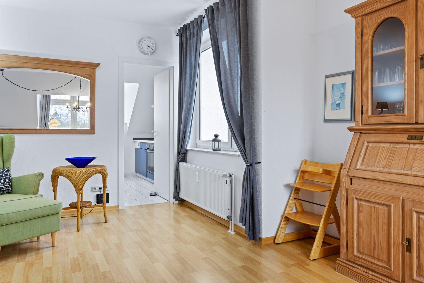 Die Ausstattung der Ferienwohnung ergibt sich weiterhin aus einem kleinen Balkon für zwei Personen, einem Bad mit Dusche und einem Gäste-WC. Das Apartment verfügt über ein Bügeleisen mit Bügelbrett, der Flur und das Wohnzimmer sind mit Laminat ausgelegt.