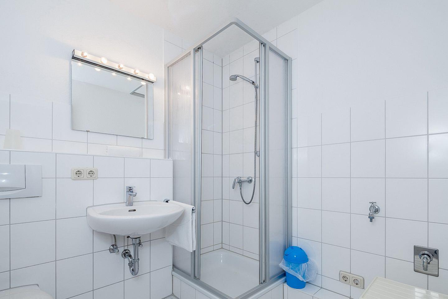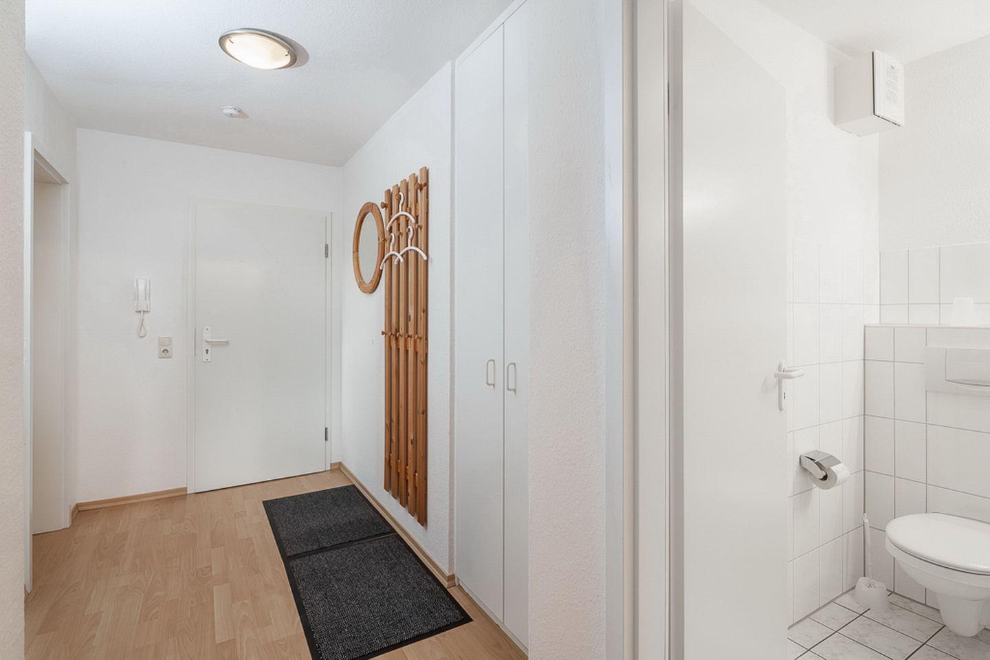 Der integrierte, geflieste Küchenbereich ist ausgestattet mit Kühlschrank, Geschirrspülmaschine, Mikrowelle, 4-Platten-Cerankochfeld mit Backofen und ausreichend Geschirr. Selbstverständlich verfügt die Wohnung über ein modernes, gefliestes Duschbad. In dieser Nichtraucherwohnung sind auch Haustiere nicht erlaubt. Im Fahrradschuppen steht dir ein Bollerwagen (ohne Gewähr) kostenlos zur Verfügung.
