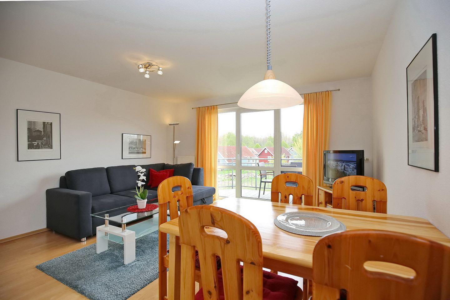 Im Wohnbereich, der mit Laminat ausgelegt ist, bietet die Doppelschlafcouch (140 cm x 190 cm) zwei Schlafplätze. Für Abwechslung – nicht nur an Regentagen – sorgen der Flachbild-TV und die Stereoanlage. Auch der Essbereich befindet sich hier.
