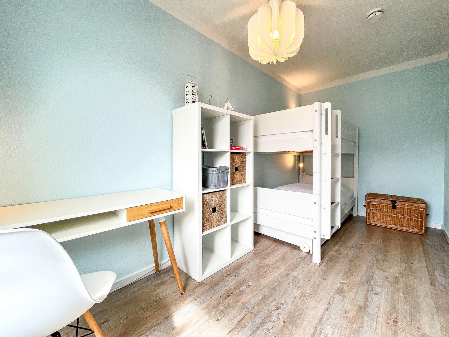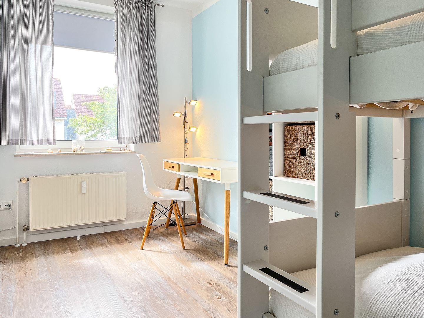 Zum Träumen verhelfen in den Schlafzimmern ein Doppelbett (2 x 90 x 200 cm) und ein Hochbett (90 x 200 cm). Zur Verdunkelung der Räume dienen Vorhänge und auf der Sonnenseite der Ferienwohnung Verdunkelungsrollos. Deine Reisegarderobe kannst du im Kleiderschrank verstauen. Kinderbücher und ein Spieleangebot erwarten dich ebenfalls.