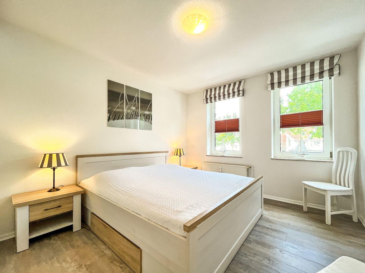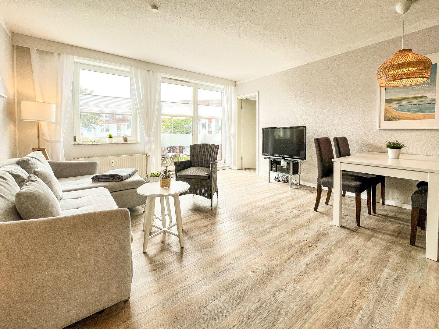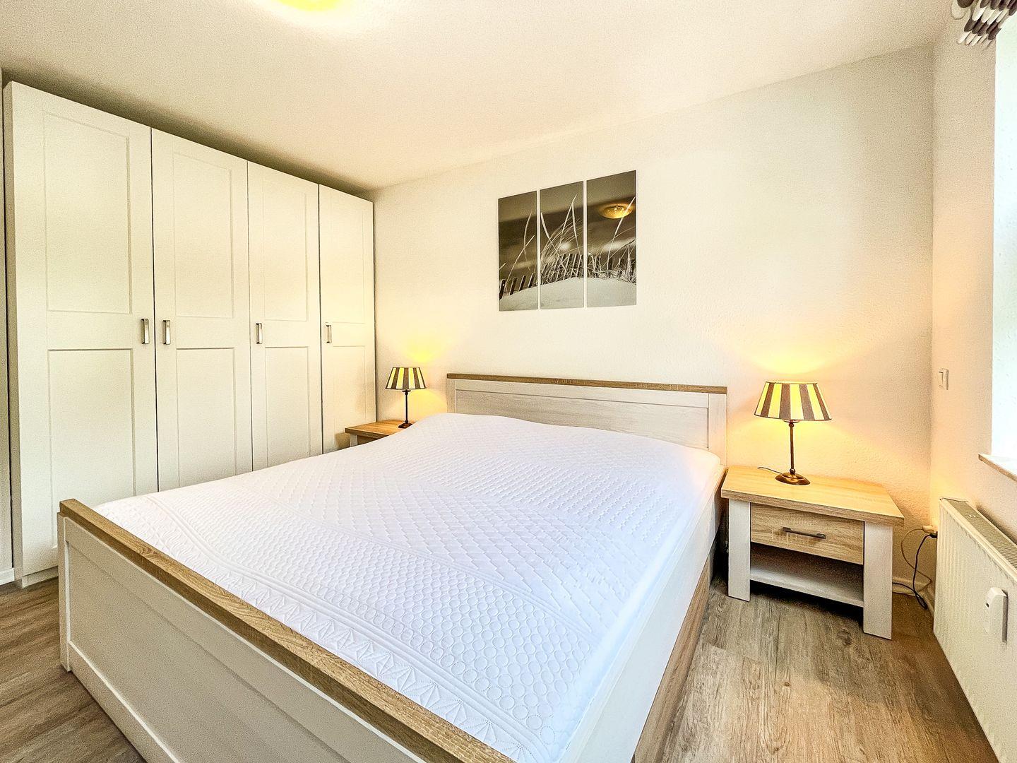 Im ersten Obergeschoss des Hauses liegt die 3-Zi.-Wohnung mit einer Wohnfläche von 59 m². Dieses Quartier ermöglicht dir und bis zu 3 weiteren Personen einen erholsamen und komfortablen Urlaub. Du bewohnst zwei Schlafzimmer, Wohn- und Essbereich, Küchenzeile und Duschbad. Die Strandentfernung beträgt von der Anlage Sünnslag ca. 400 m.