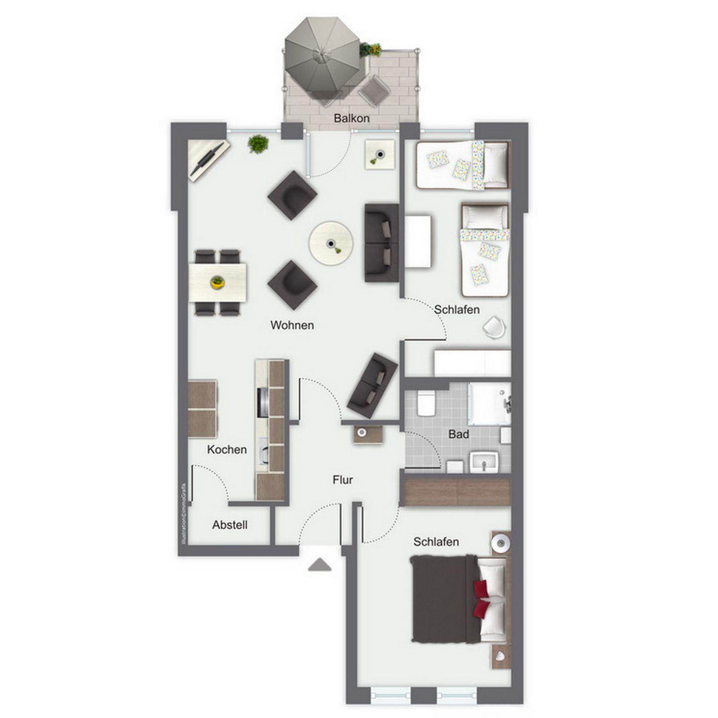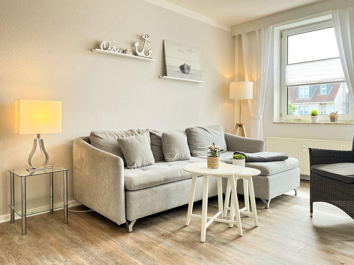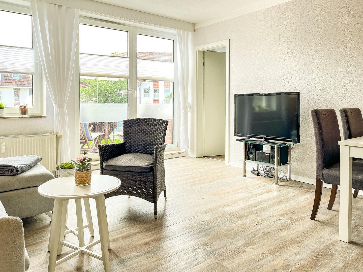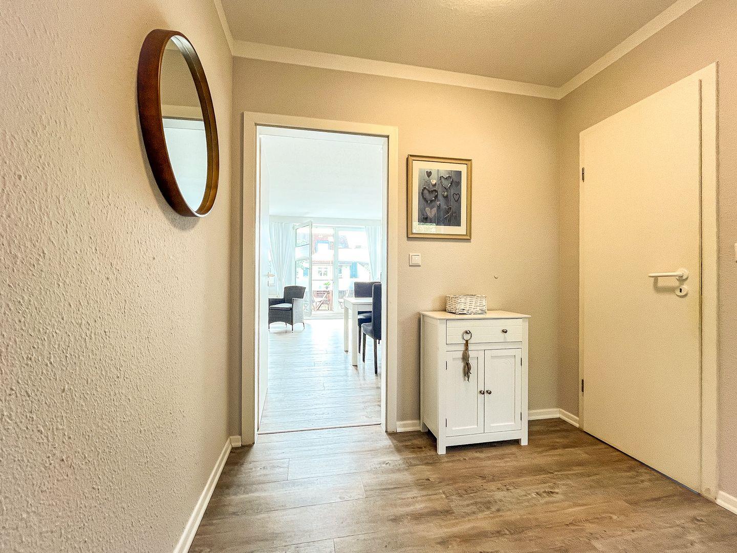 Im ersten Obergeschoss des Hauses liegt die 3-Zi.-Wohnung mit einer Wohnfläche von 59 m². Dieses Quartier ermöglicht dir und bis zu 3 weiteren Personen einen erholsamen und komfortablen Urlaub. Du bewohnst zwei Schlafzimmer, Wohn- und Essbereich, Küchenzeile und Duschbad. Die Strandentfernung beträgt von der Anlage Sünnslag ca. 400 m.
