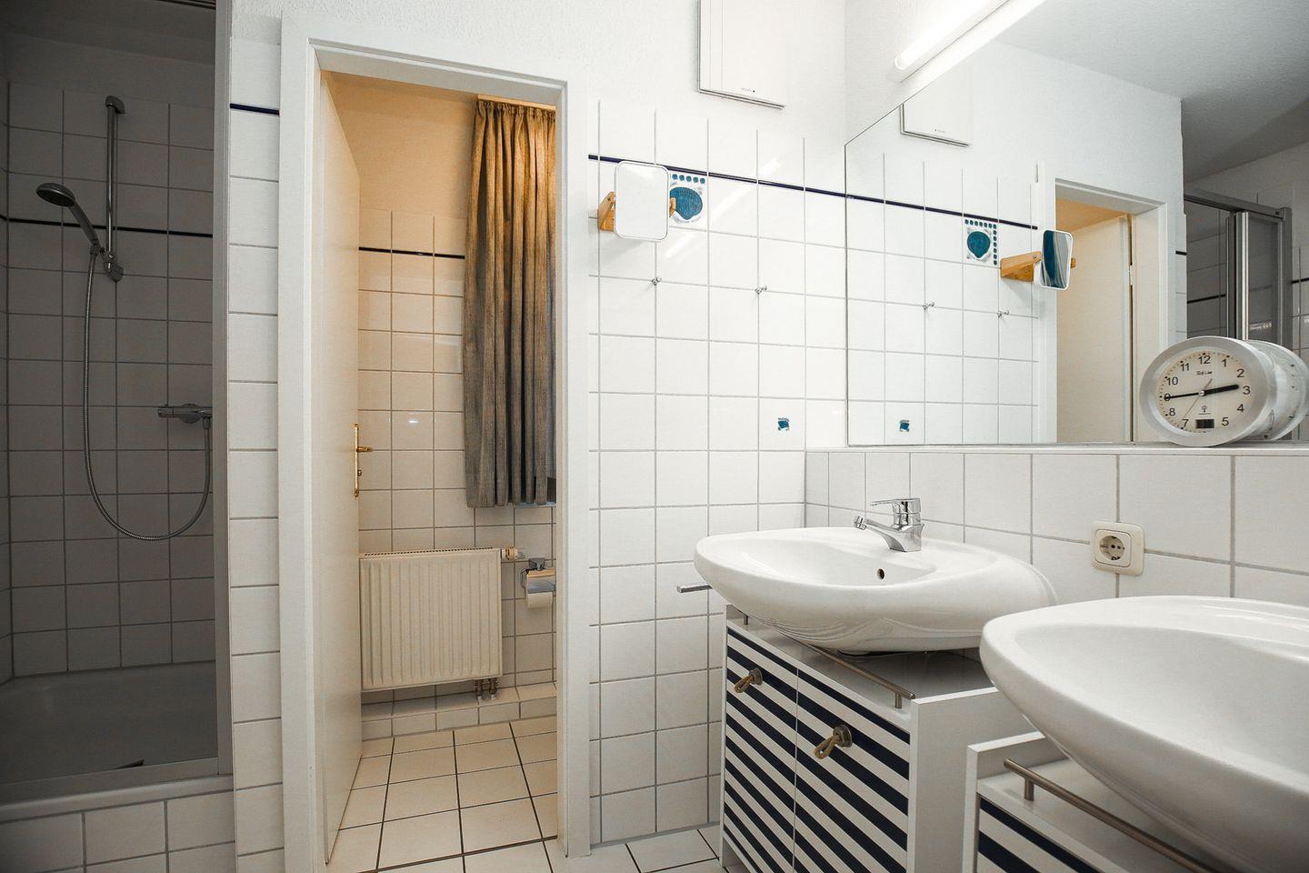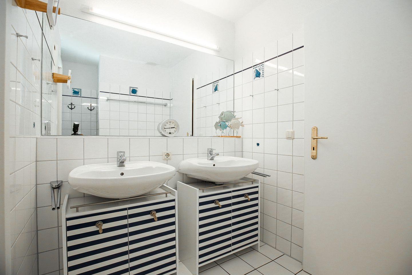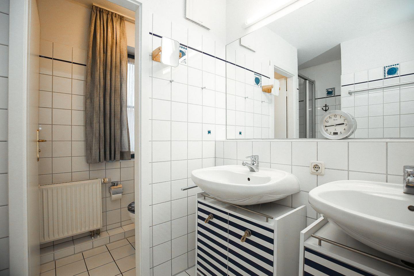 In dem geräumigen Duschbad mit zwei Waschbecken gibt es ein separates WC mit Fenster. In dieser Nichtraucherwohnung sind Haustiere nicht erlaubt.