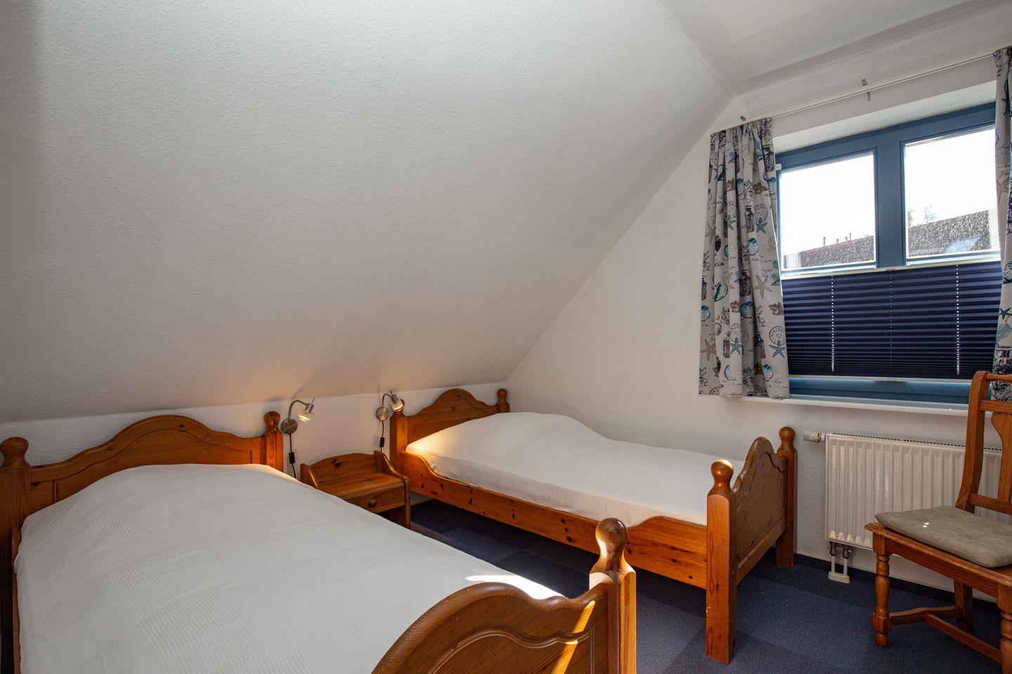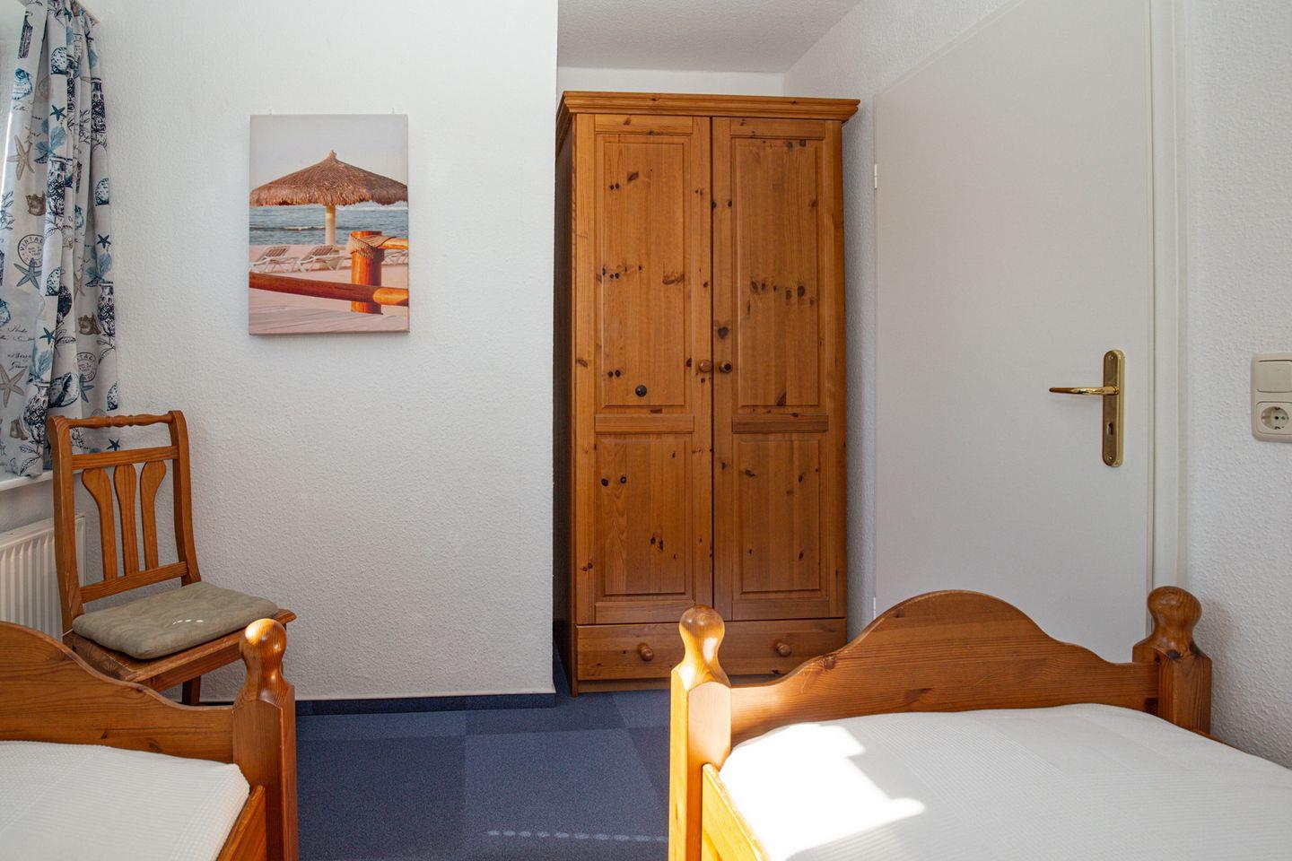 Im Schlafzimmer im 1. OG findest du neben zwei Einzelbetten (2 x 90 x 200 cm) auch einen Kleiderschrank. Ein Verdunklungsrollo sorgt für erholsamen Schlaf. In den beiden Schlafzimmern im Obergeschoss befinden sich jeweils ein Doppelbett (2 x 90 x 200 cm und 2 x 80 x 200 cm) und ein Kleiderschrank. Die Fenster werden durch Vorhänge verdunkelt.