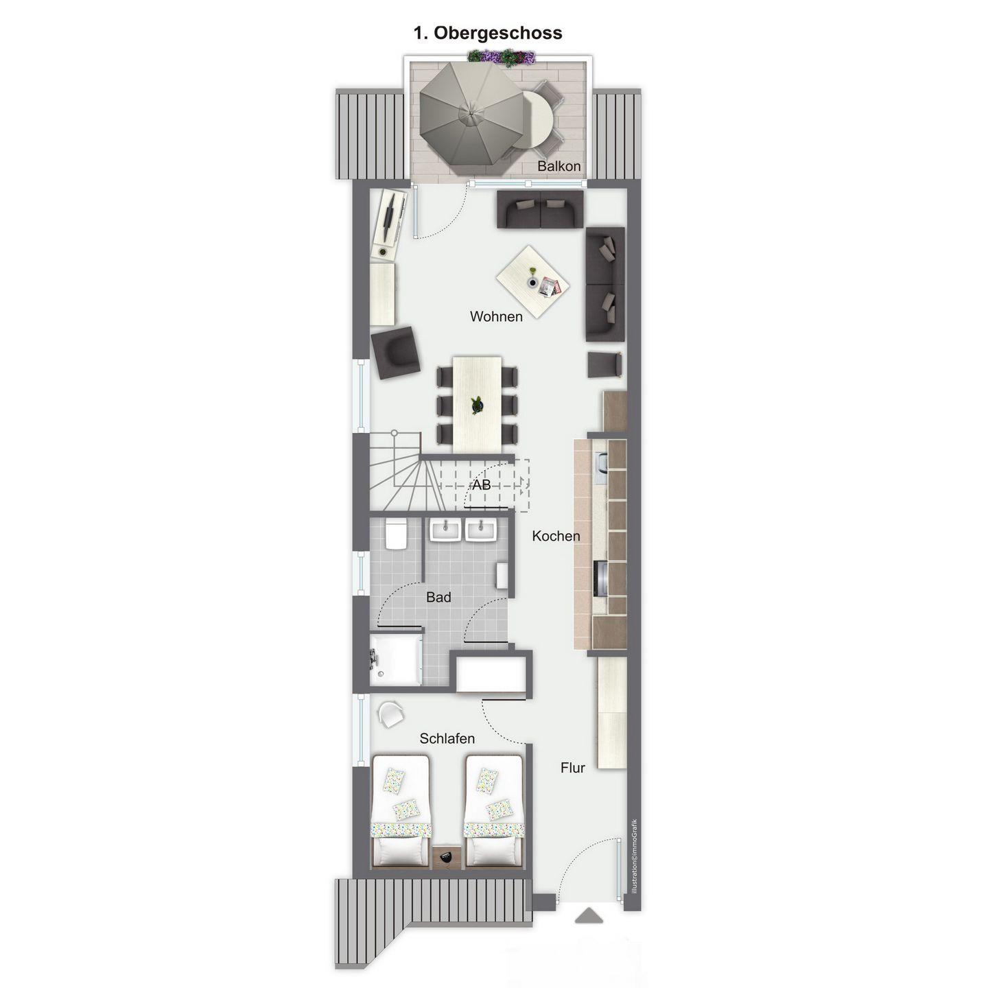 Den möblierten Balkon erreichst du direkt vom Wohnbereich. Im Wohnraum befinden sich die bequeme Sitzgruppe und der großzügige Essbereich für sechs Personen. Für deine Unterhaltung sorgen ein Flachbild-TV, eine Stereoanlage und eine Auswahl an Spielen und Büchern. Über eine innenliegende Treppe erreichst du die beiden Schlafzimmer im Dachgeschoss. Im Wohnbereich ist Laminat ausgelegt und in den Schlafzimmern befinden sich Teppichböden.