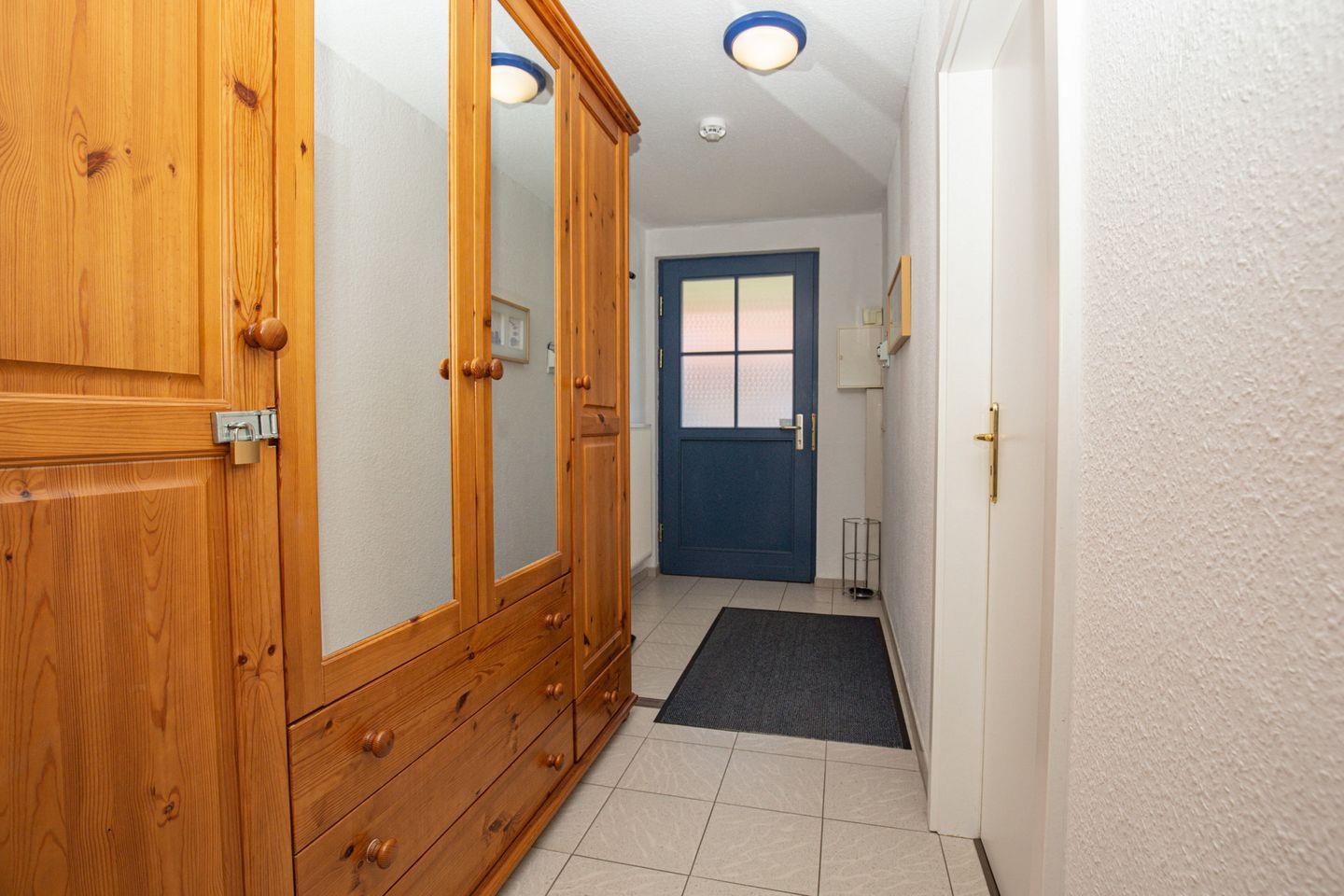 Die Küchenzeile ist mit einem Geschirrspüler, einem Backofen, einem 4-Plattenherd (Ceranfeld) und einem Kühlschrank mit Gefrierfach ausgestattet. Der Eingangs- und Küchenbereich ist gefliest. In einem Kleiderschrank auf dem Flur kannst du deine Garderobe aufbewahren.