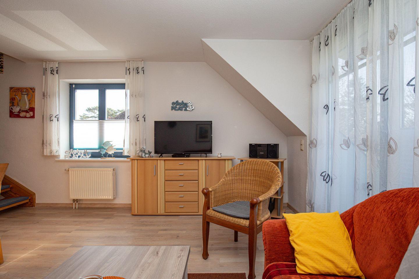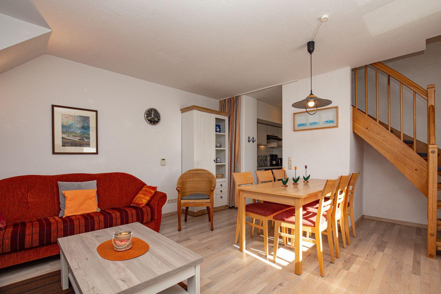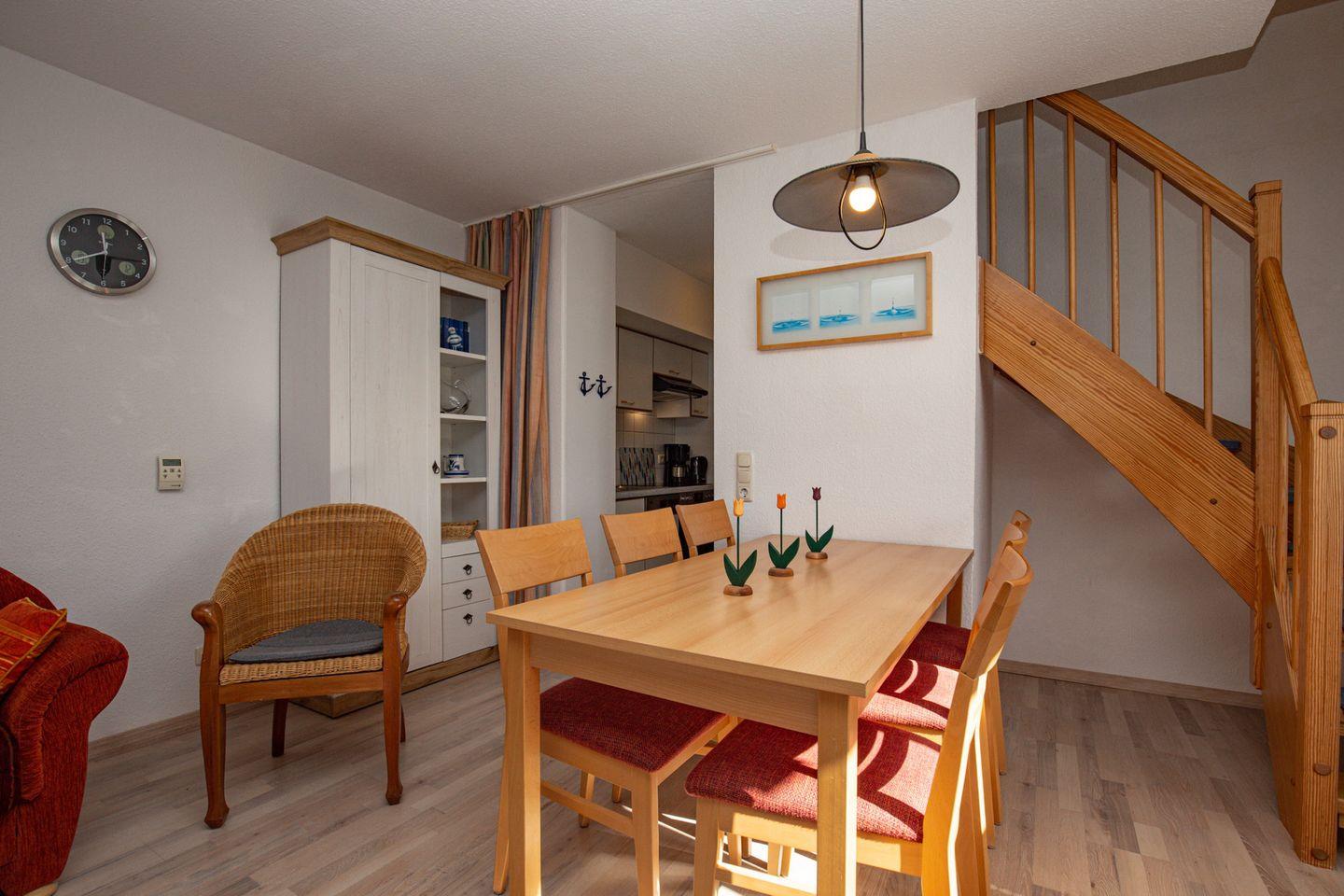 Das helle und freundliche 4-Zimmer-Ferienwohnung mit einem Balkon in Süd-West-Lage liegt im 1. OG am Anfang des Hauses 1. Du erreichst die Wohnung über die Außentreppe. Die Wohnung mit ca. 70 m² Wohnfläche verläuft über 2 Etagen und hat einen Wohn- und Essbereich, drei Schlafzimmer, eine Küchenzeile und ein Duschbad. Zum Strand sind es vom Feriendorf Papillon nur etwa 250 m.