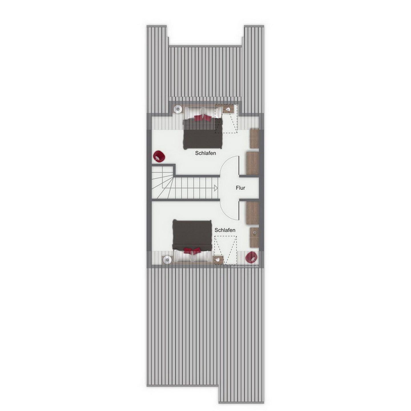 Über eine innenliegende Treppe im Wohnraum gelangst du ins Obergeschoss. Hier erwarten dich zwei weitere Schlafzimmer mit einem Doppelbett (2 x 90 x 200 cm) sowie zwei Einzelbetten (90 x 200 cm) jeweils und einem Kleiderschrank. Die Fenster werden in den Schlafräumen mit Rollos abgedunkelt. Der Boden ist auf der oberen Ebene mit Laminat ausgelegt.