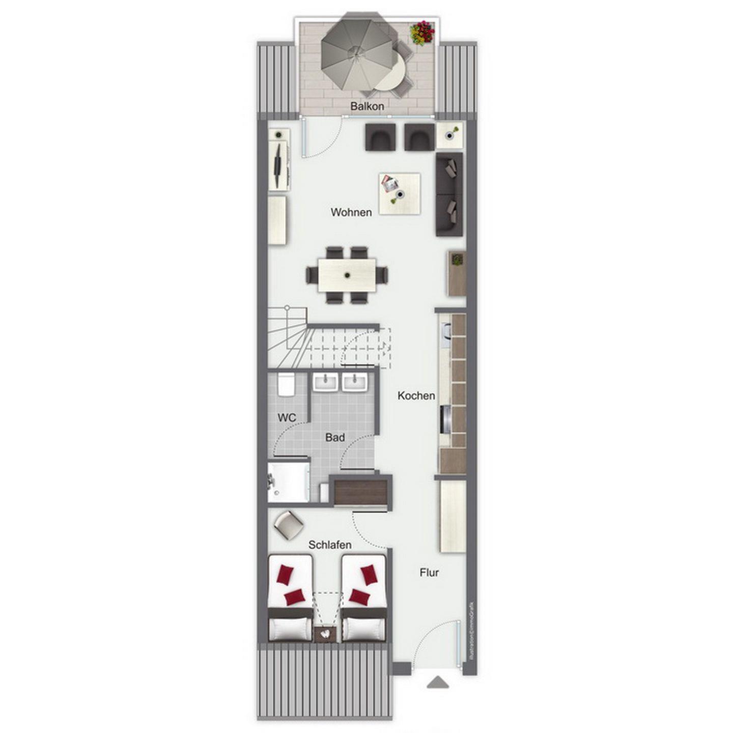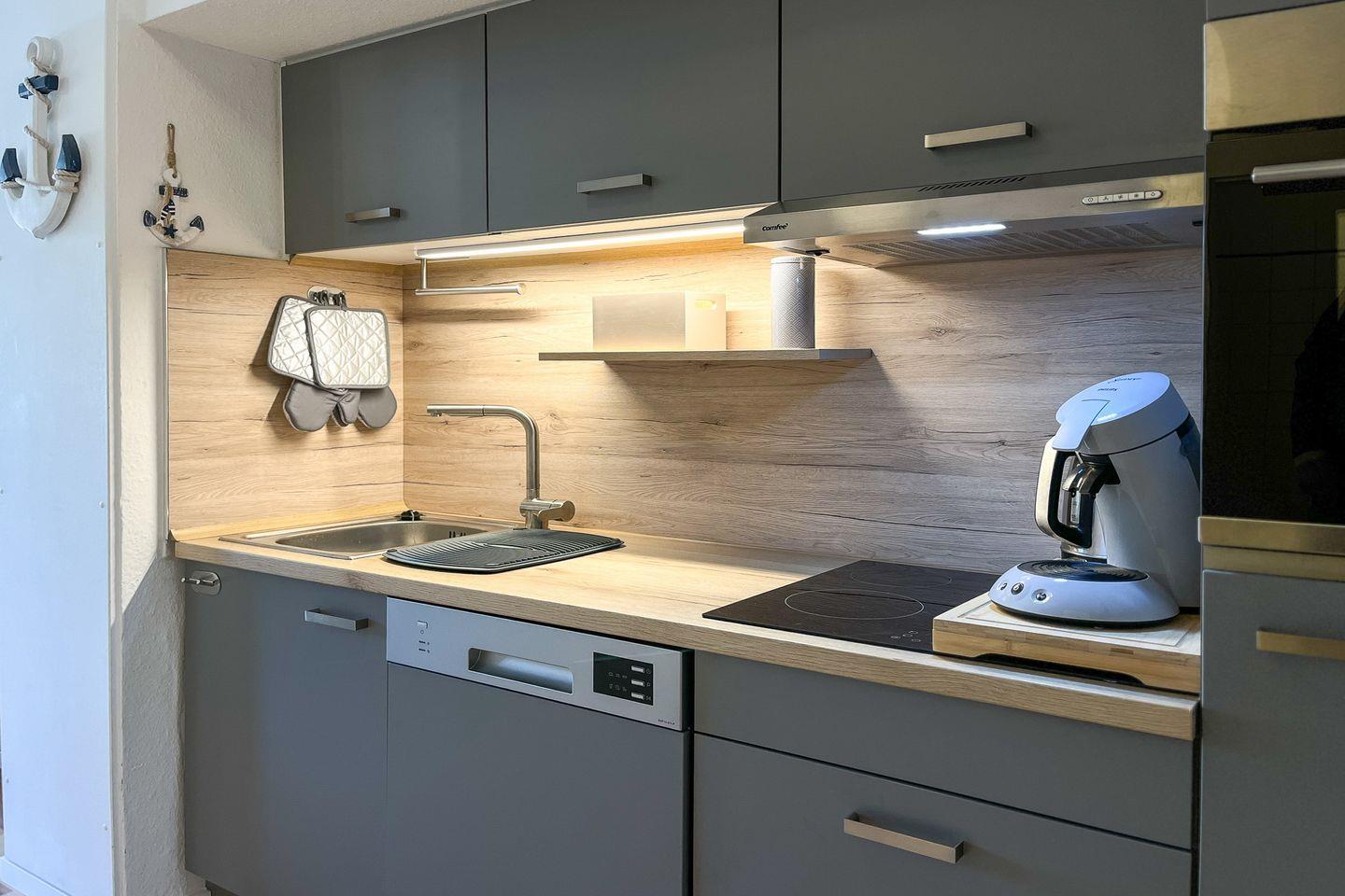 Zur praktischen Küchenzeile gehören ein Backofen, ein Geschirrspüler, ein Kühlschrank mit Gefrierfach und ein 4-Plattenkochfeld. Das Schlafzimmer auf der unteren Ebene ist mit einem Schlafsofa (140 x 195 cm) und einem Kleiderschrank eingerichtet. Als Bodenbelag wurde im Untergeschoss Laminat gewählt.