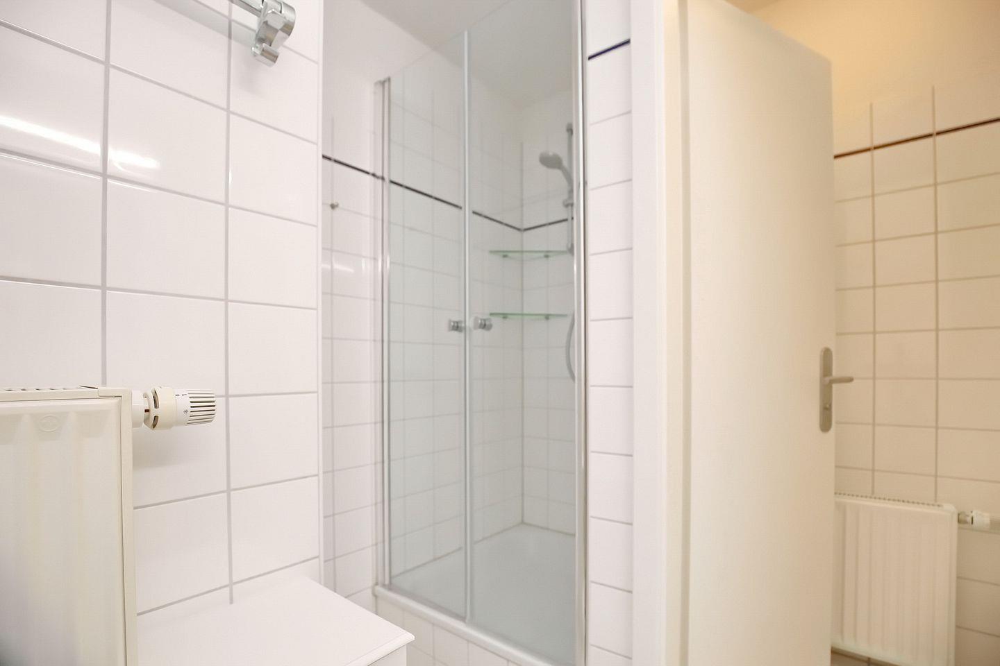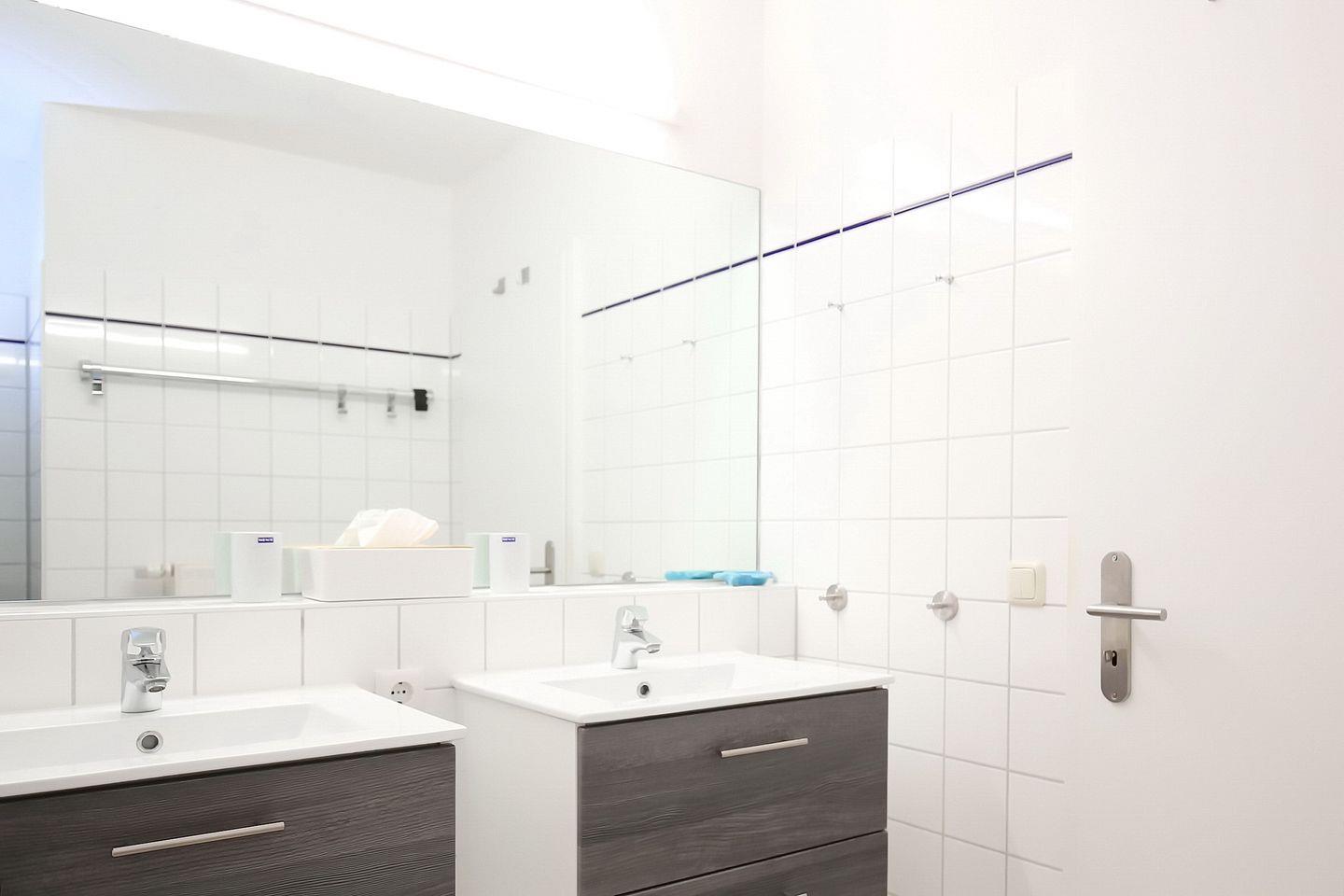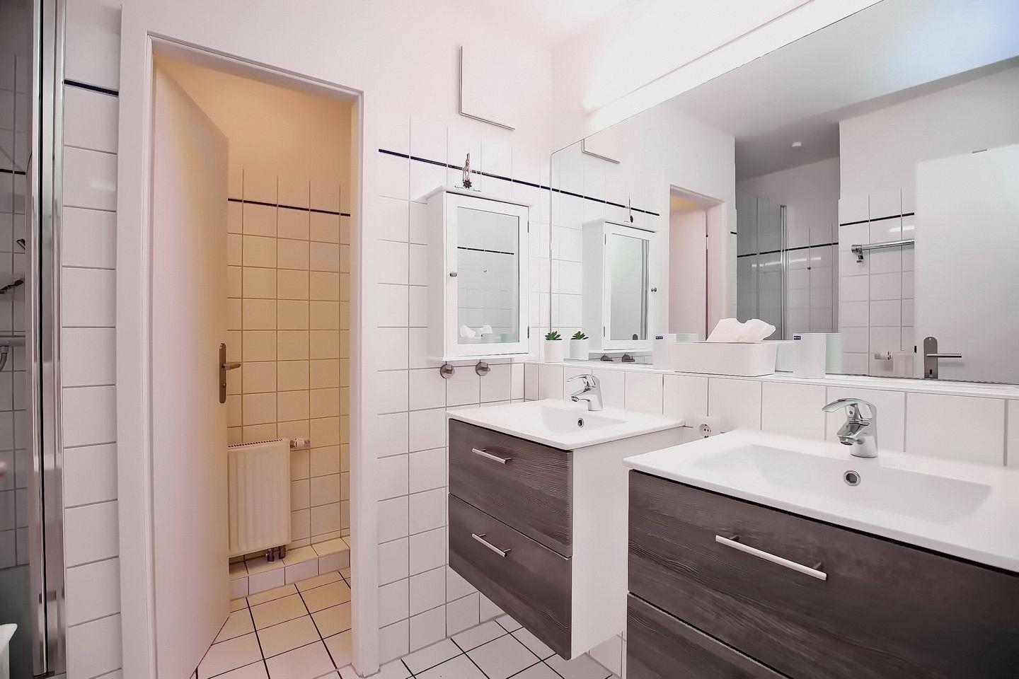 Ein gefliestes Duschbad mit separatem WC und zwei Waschbecken ist vorhanden. Fahrräder können im Fahrradständer am Haus abgestellt werden. In dieser Nichtraucherwohnung ist maximal 1 Haustier erlaubt.