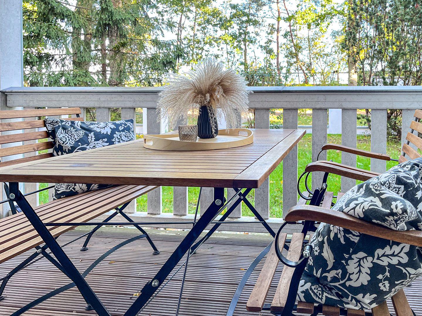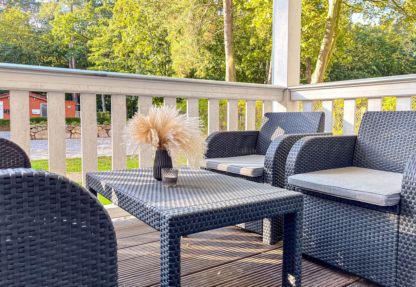 Das Wohnzimmer lädt dich zum Wohlfühlen und Entspannen ein. Bodentiefe Fensterelemente bieten dir ein großzügiges Wohngefühl. Neben der Standardausstattung des Wohnzimmers, wie zum Beispiel einer gemütlichen Couch sowie zwei Sesseln, ist selbstverständlich ein großer Flachbildfernseher vorhanden. Vom Wohnzimmer aus gelangst du auf den möblierten Balkon, der zur Seeseite ausgerichtet ist.