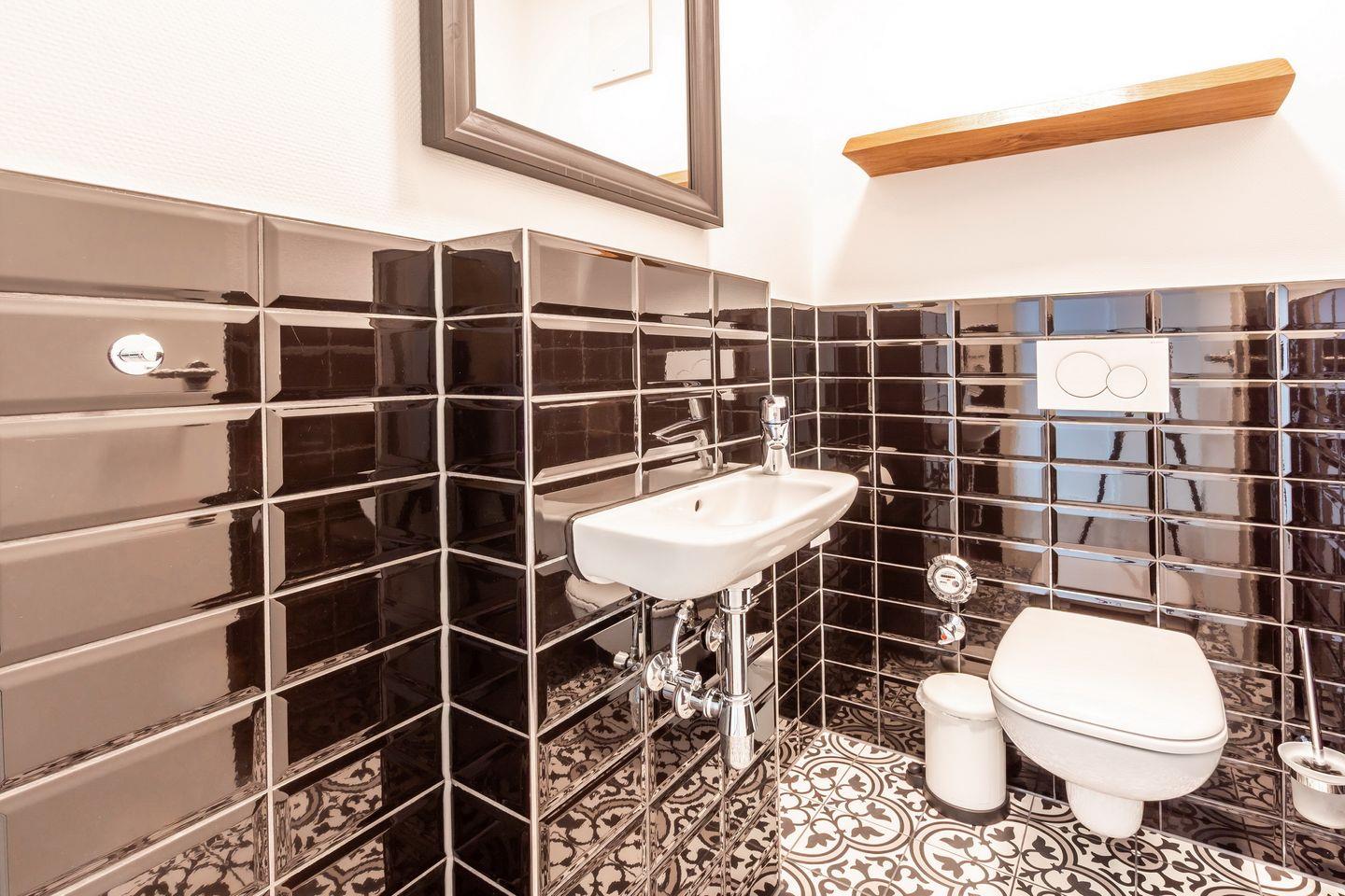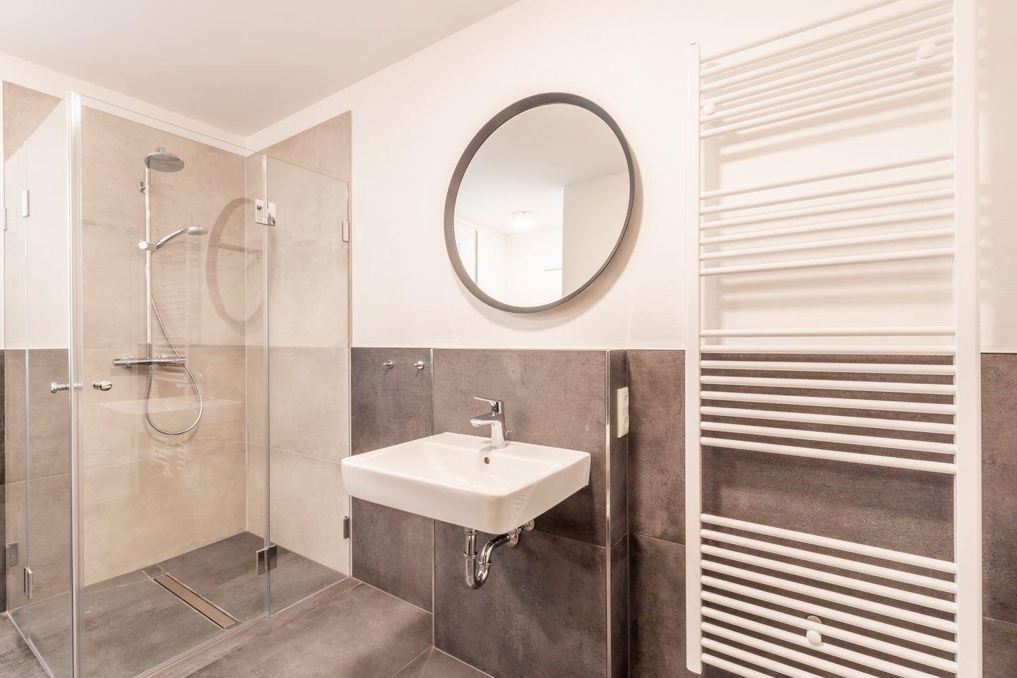 Das stilvolle Bad ist modern gefliest und mit einem Waschtisch, einer bodengleichen Dusche, einem WC sowie einem Handtuchheizkörper ausgestattet. Zusätzlich ist ein Gäste-WC vorhanden.