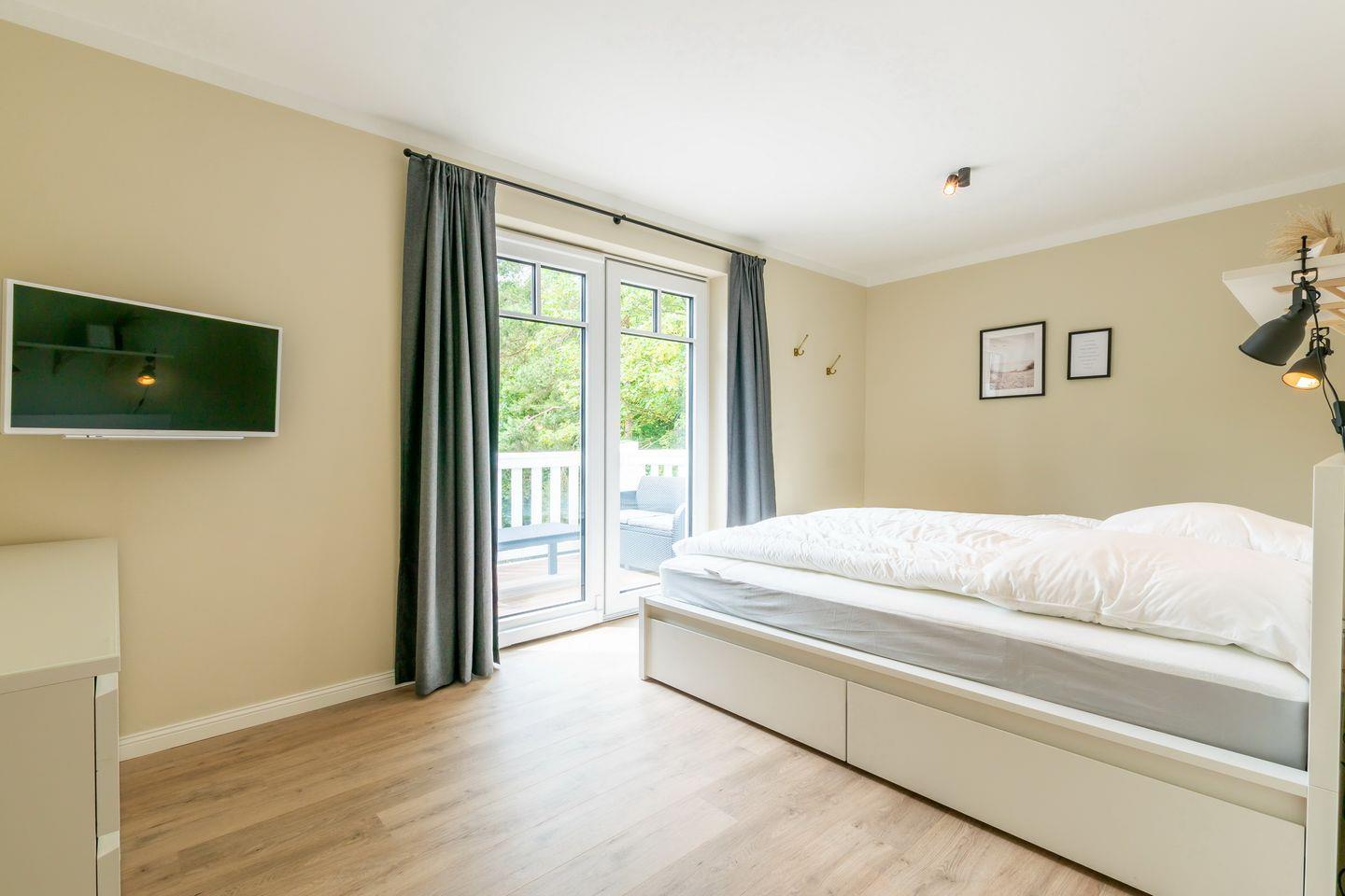 Auch das zweite Schlafzimmer ist über den Flur erreichbar und verfügt über ein gemütliches Doppelbett (2 x 90 x 200 cm). Deine Kleidung kann in einer Kommode untergebracht werden. Für einen erholsamen Schlaf dienen Verdunklungsvorhänge. Ein zusätzlicher Flachbildfernseher steht dir hier zur Verfügung. Über dieses Schlafzimmer gelangst du zum Südbalkon. Auf der bequemen Lounge-Garnitur kannst du es dir gemütlich machen und die Abendsonne genießen.