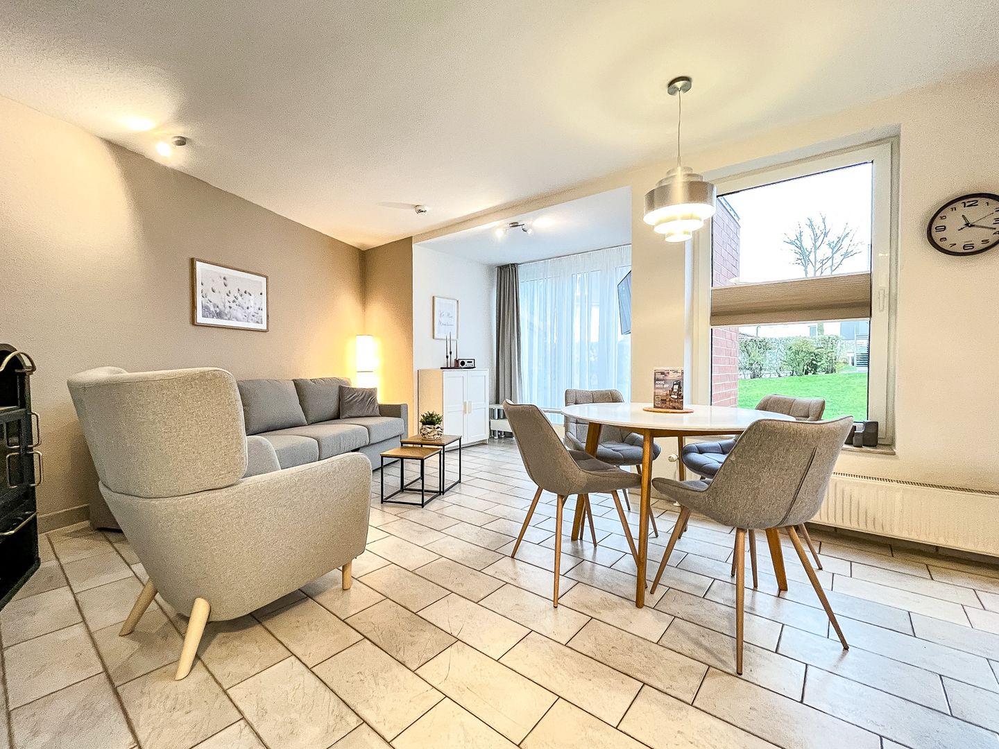 Du bewohnst im Erdgeschoss ein komfortables 2-Zimmer-Apartment mit Terrasse in Südlage. Es erwartet dich ein Wohn-/ Essbereich mit Kamin, ein Schlafzimmer, eine Küchenzeile sowie ein Duschbad. Die Strandentfernung beträgt von der Anlage Sünnslag ca. 400 m.