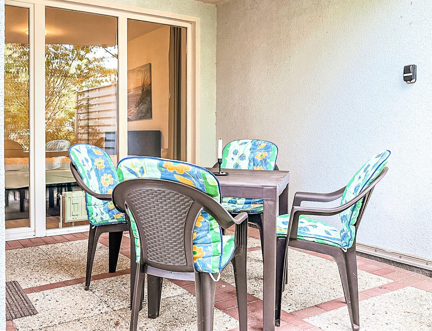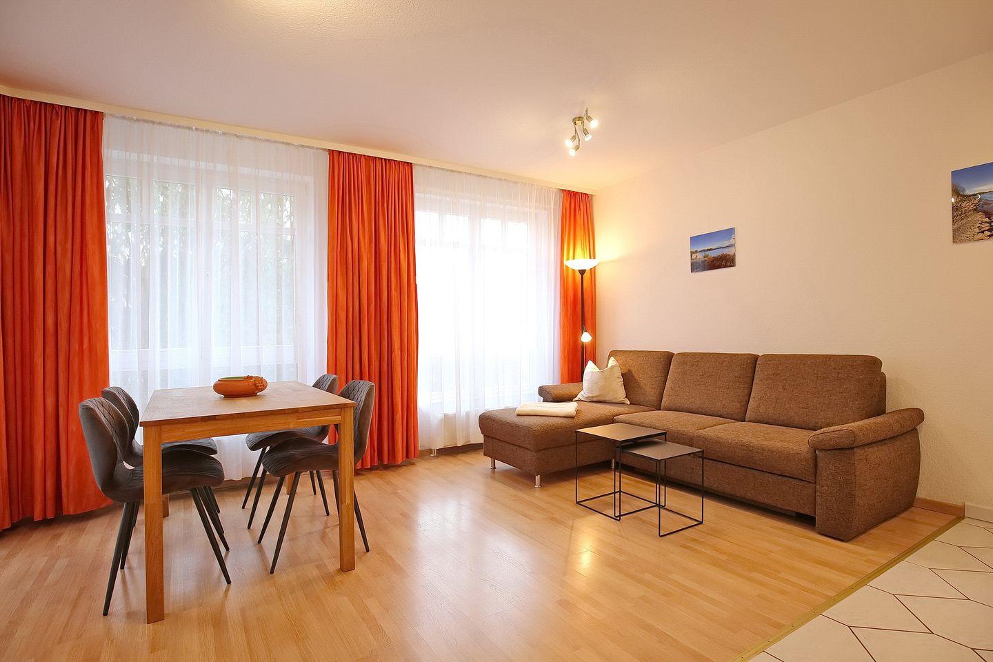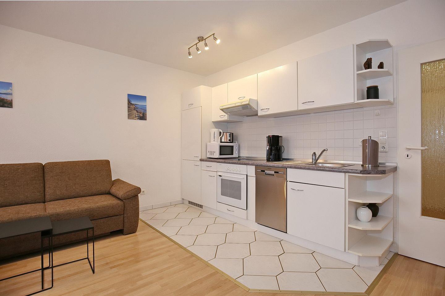 Die ca. 42 m² große Ferienwohnung liegt im Erdgeschoss und hat eine Terrasse in Nordlage. Weiterhin verfügst du über ein Wohnzimmer mit Küchenzeile, ein Schlafzimmer und ein Duschbad. Zum Strand sind es nur 70 Meter.