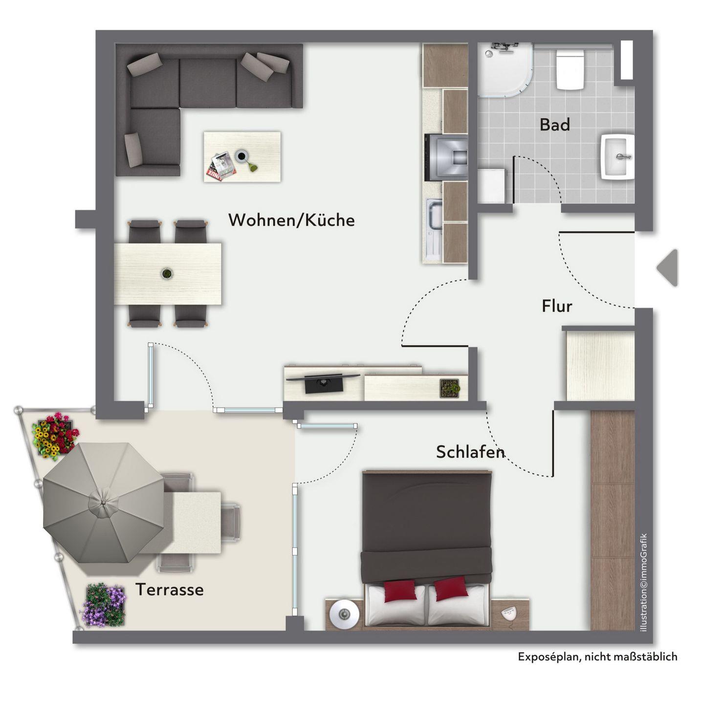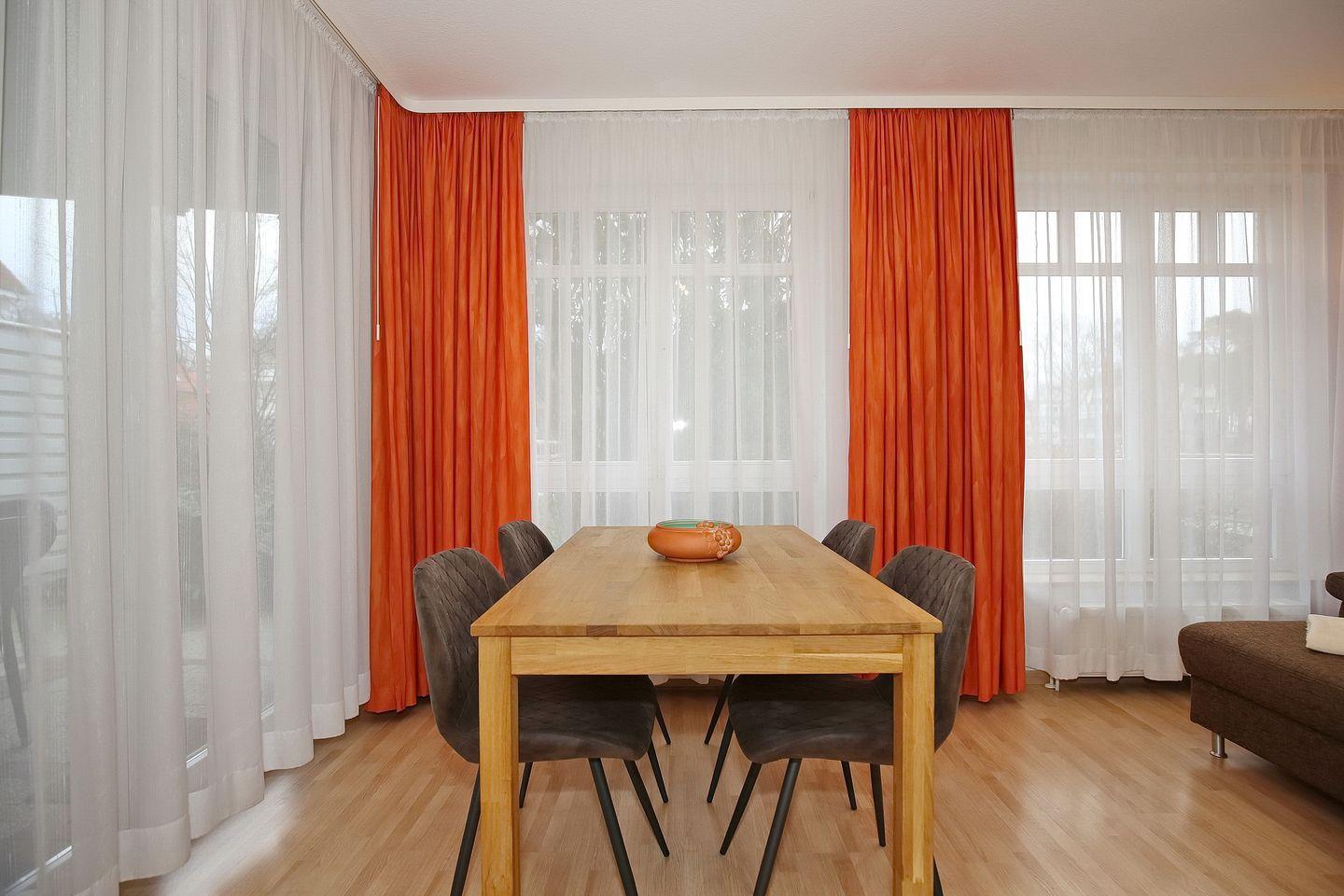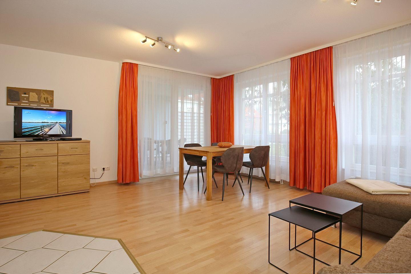 Die ca. 42 m² große Ferienwohnung liegt im Erdgeschoss und hat eine Terrasse in Nordlage. Weiterhin verfügst du über ein Wohnzimmer mit Küchenzeile, ein Schlafzimmer und ein Duschbad. Zum Strand sind es nur 70 Meter.