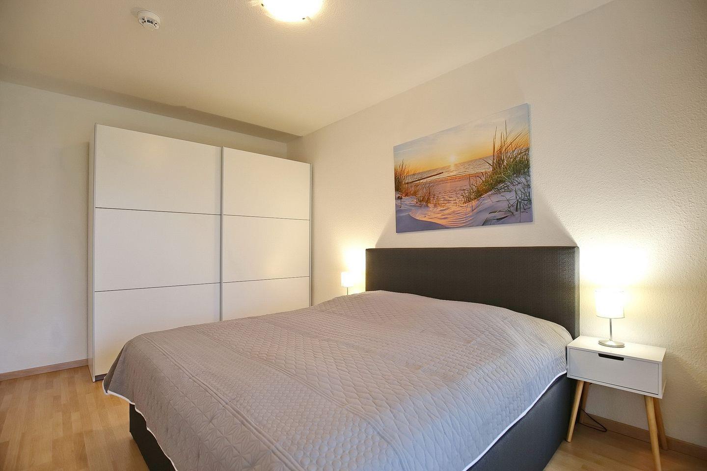 Das Schlafzimmer ist mit einem Boxspringbett (2 x 90 x 200 cm) ausgestattet. Ein geräumiger Kleiderschrank für deine Urlaubsgarderobe ist natürlich auch vorhanden. Der Bodenbelag ist hier Laminat. An den Fenstern sorgt ein Verdunklungsvorhang für eine ungestörte Nachtruhe.