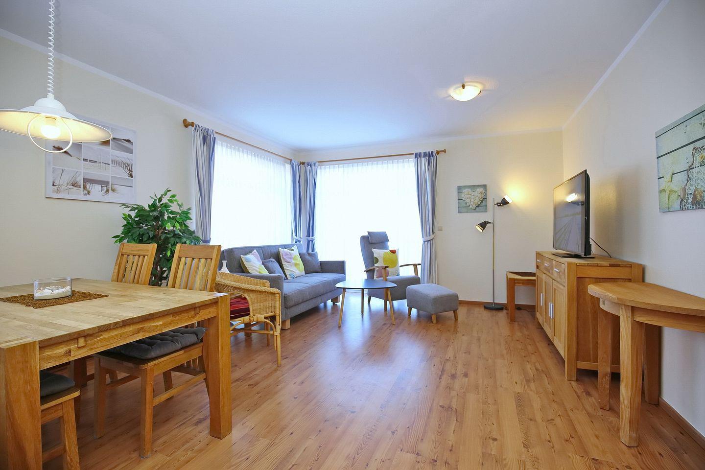 In dieser 52 m² großen, mit Laminat ausgelegten Ferienwohnung erwartet dich ein helles, freundlich ausgestattetes Wohn- und Esszimmer mit Einbauküche und Zugang zum Balkon in Richtung Ostsee, ein Schlafzimmer und ein gefliestes Duschbad. In der Wohnung sorgen moderne Farben und ein harmonischer Stil für eine gemütliche Atmosphäre. Zum Strand sind es nur ca. 100 m.