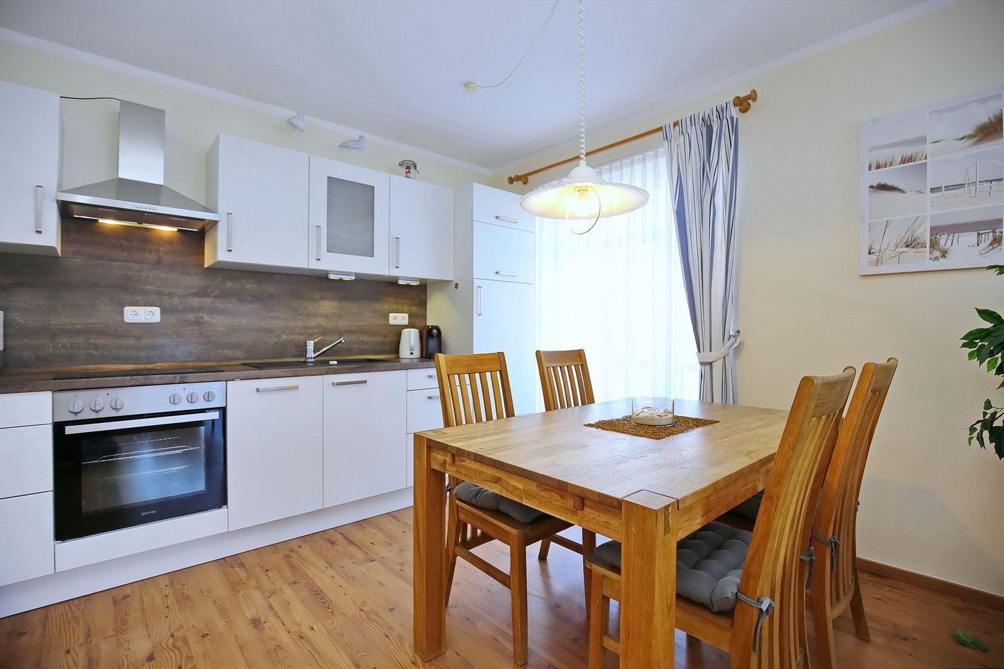 Die umfangreich ausgestattete Einbauküche beinhaltet unter anderem einen Kühlschrank mit Gefrierfach, einen Geschirrspüler, ein 4-Platten-Cerankochfeld mit Backofen, eine Dunstabzugshaube und eine Mikrowelle.