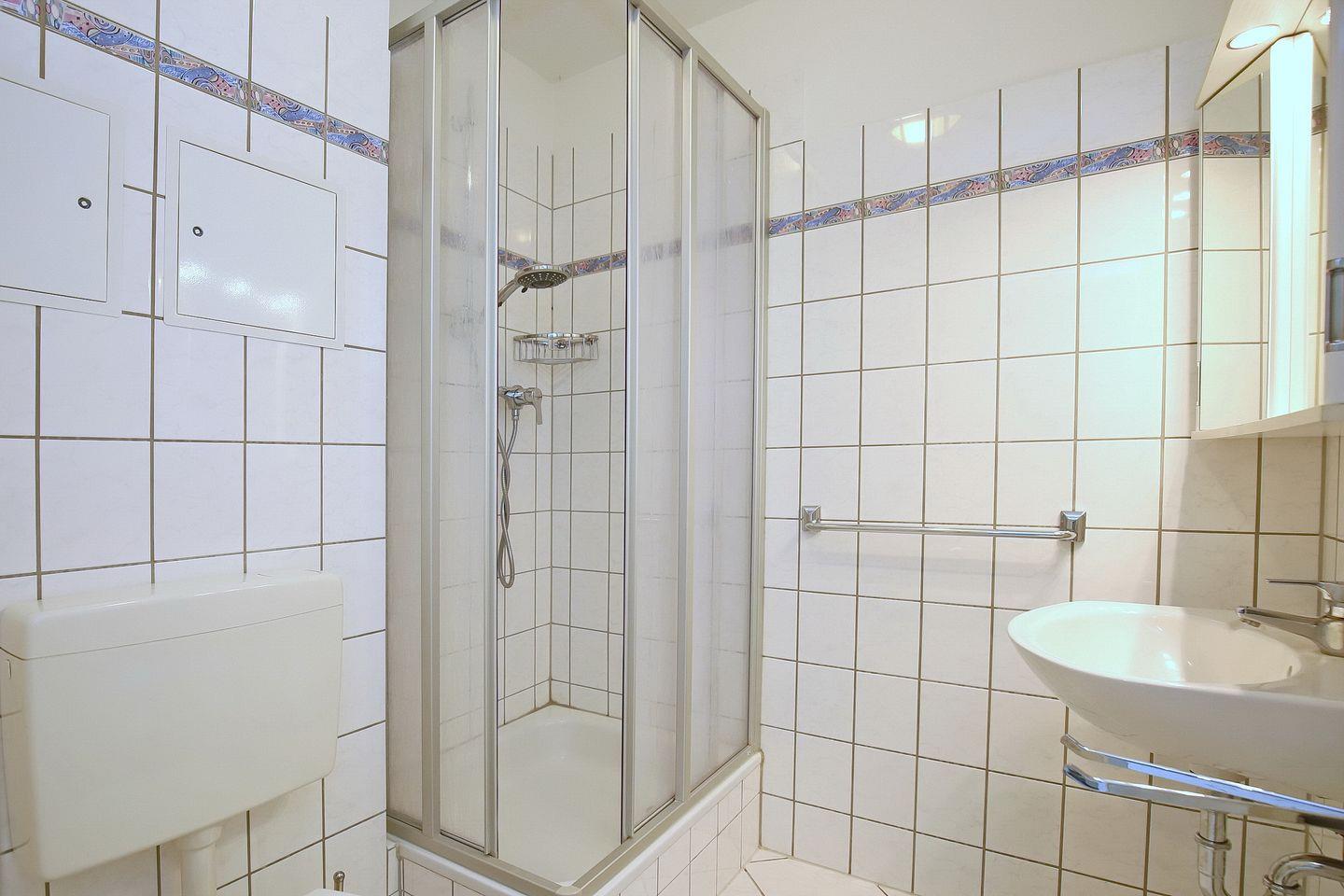 Im Duschbad wurden Fliesen als Bodenbelag gewählt. Haustiere sind in dieser Nichtraucherwohnung nicht erlaubt.