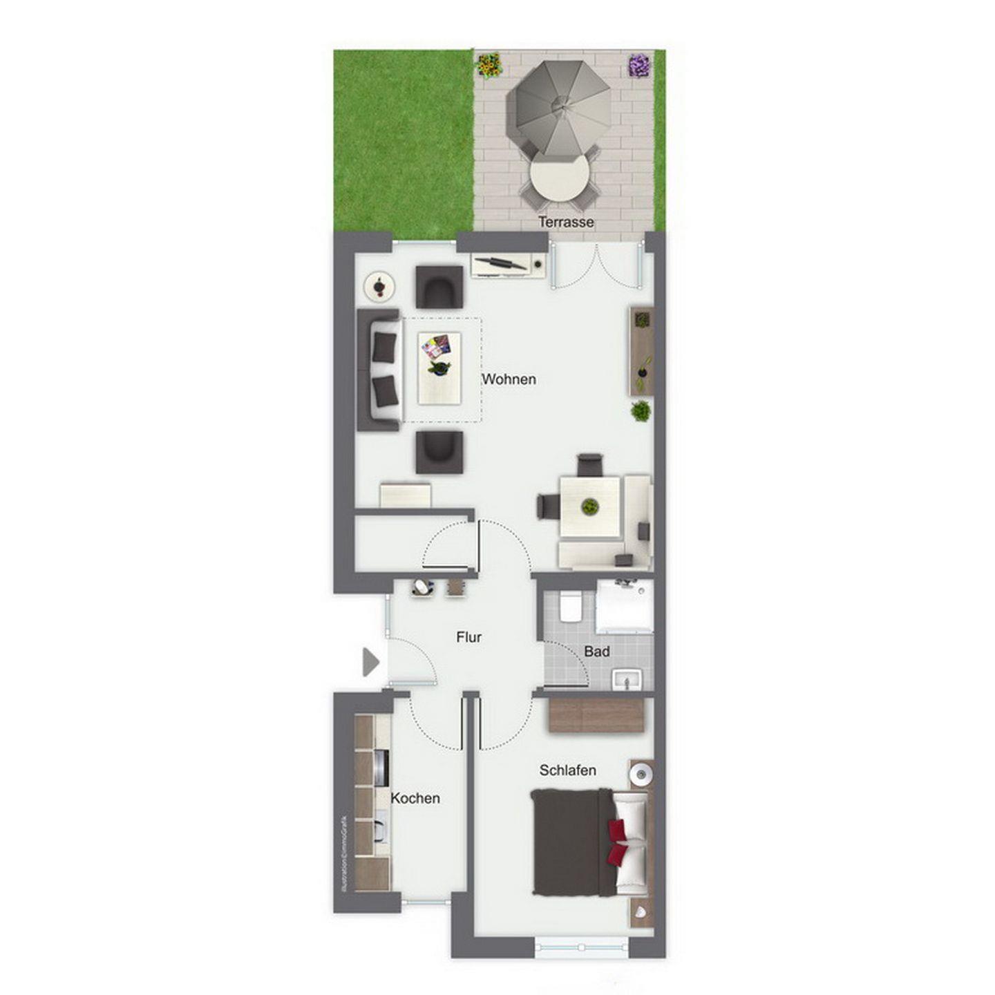 Vom Wohnbereich aus gelangst du auf die möblierte Terrasse. Eine kleine Hecke dient als Sichtschutz. Im hellen Wohnzimmer befinden sich ein gemütliches Sofa und der Essbereich. Zum Zeitvertreib stehen ein TV und ein Radio bereit. Der Bodenbelag ist hier Vinyl.
