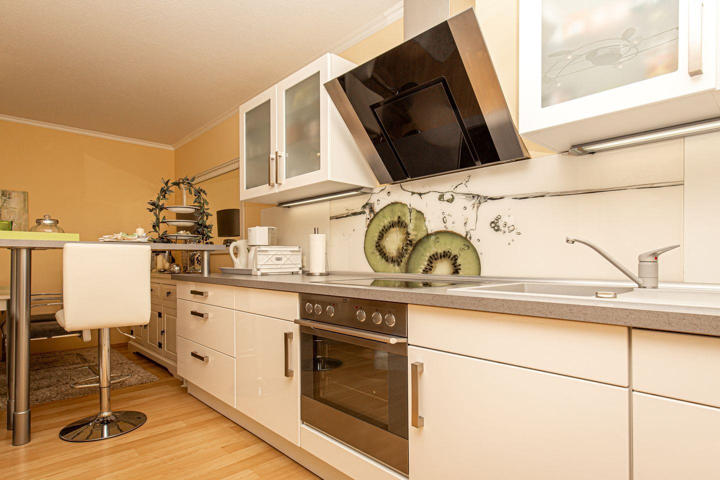 Die Küchenzeile ist im Wohnzimmer integriert und ist mit einem Kühlschrank mit Gefrierfach, Geschirrspüler, einem Backofen sowie einem 4-Platten-Cerankochfeld und Mikrowelle gut ausgestattet.