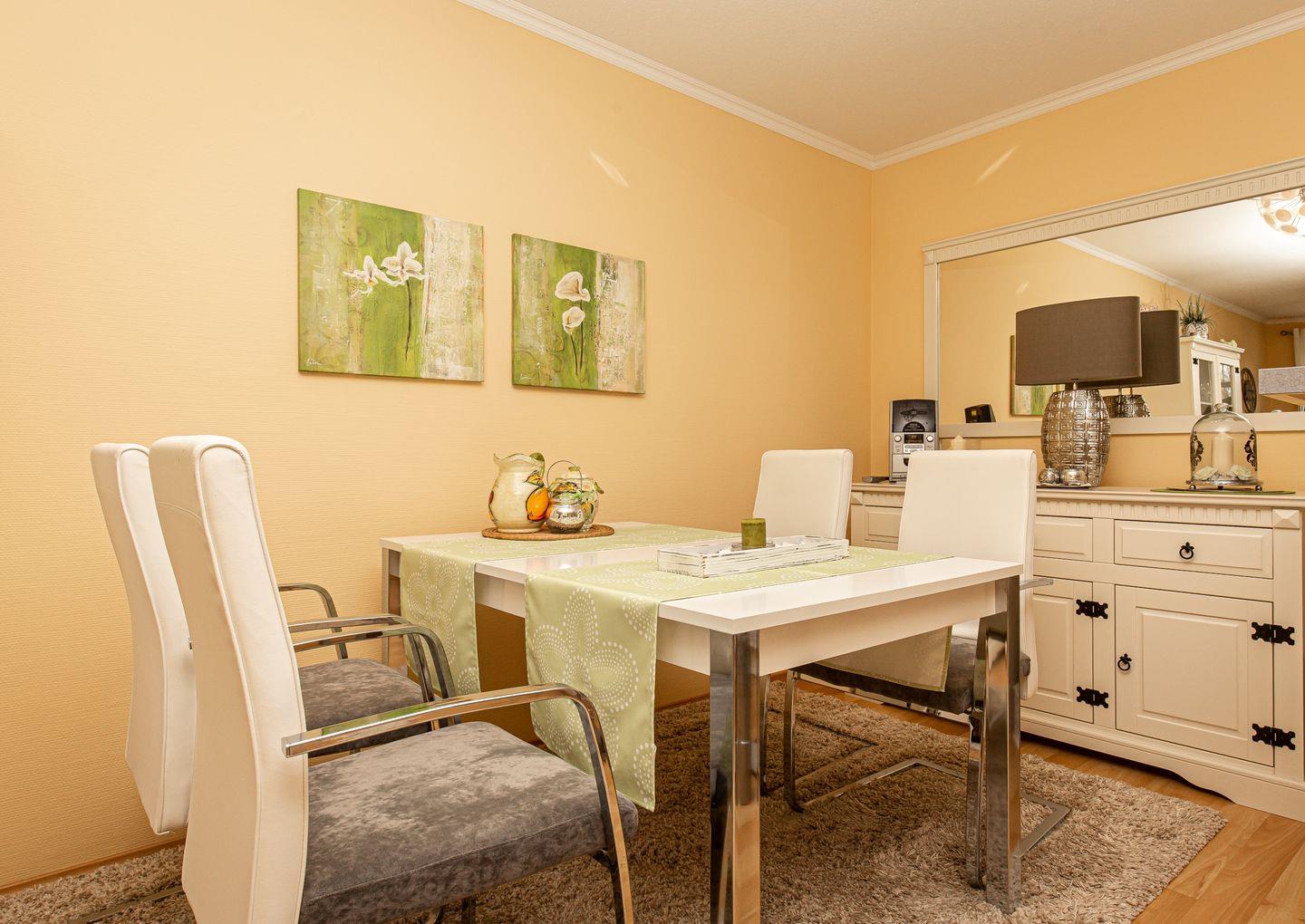 Im Wohnbereich lädt die gemütliche Couch zum Verweilen ein. Es stehen dir ein Flachbild-TV und eine Stereoanlage zur Verfügung. Die Couch ist ausziehbar. Der moderne Esstisch bietet den idealen Platz für gemeinsame Mahlzeiten. Vom Balkon aus hast du einen atemberaubend schönen Blick auf die Haffwiesen und das daran grenzende Naturschutzgebiet Tarnewitzer Urwald.