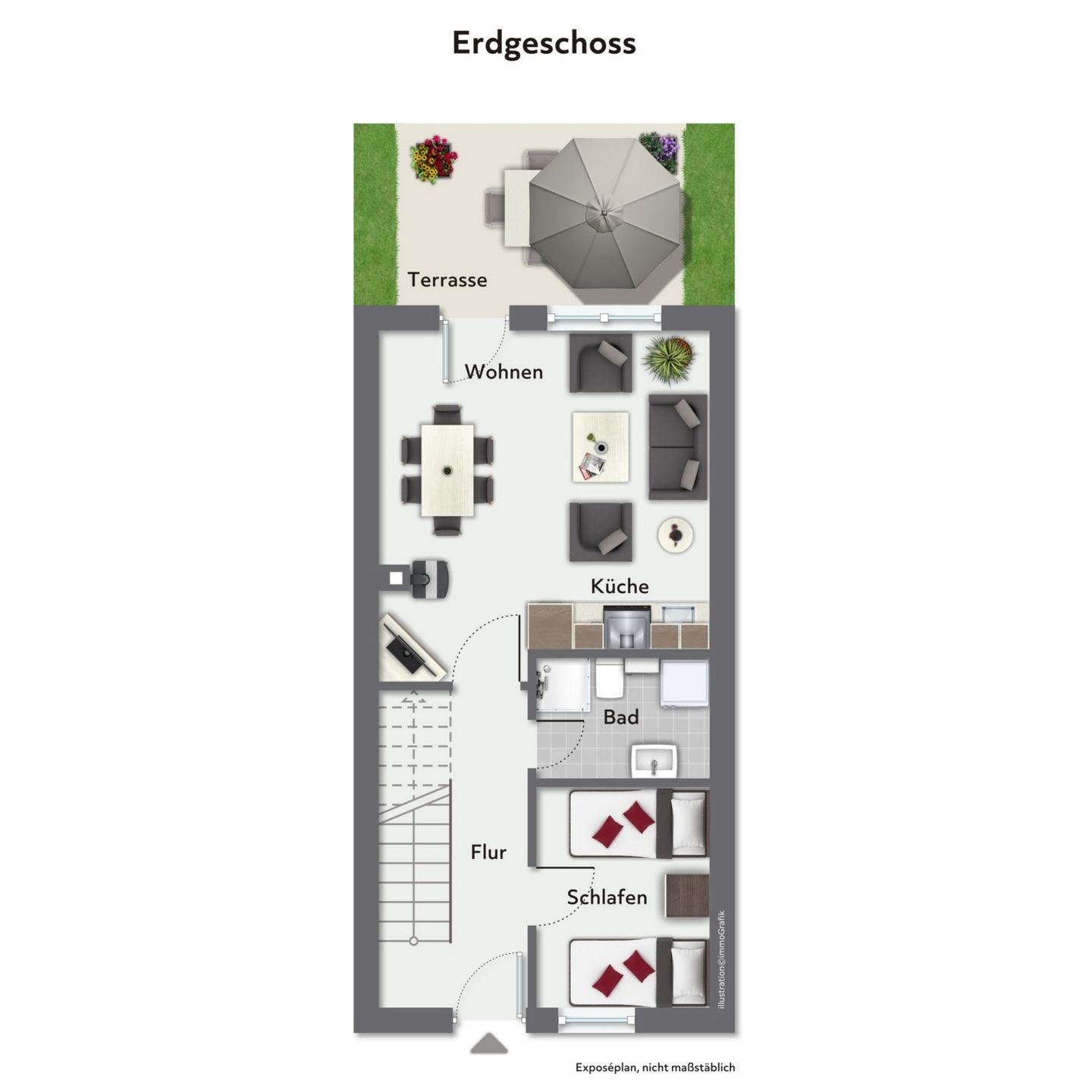 Die Küchenzeile mit 4-Plattenkochfeld, Backofen, Spülmaschine und Kühlschrank mit Gefrierfach ist im Wohn/Essbereich im Erdgeschoss integriert. Die Küche ist mit Kaffeemaschine, Wasserkocher, Toaster und reichlich Geschirr ausgestattet.