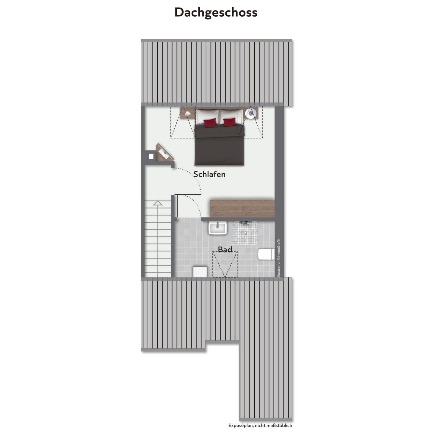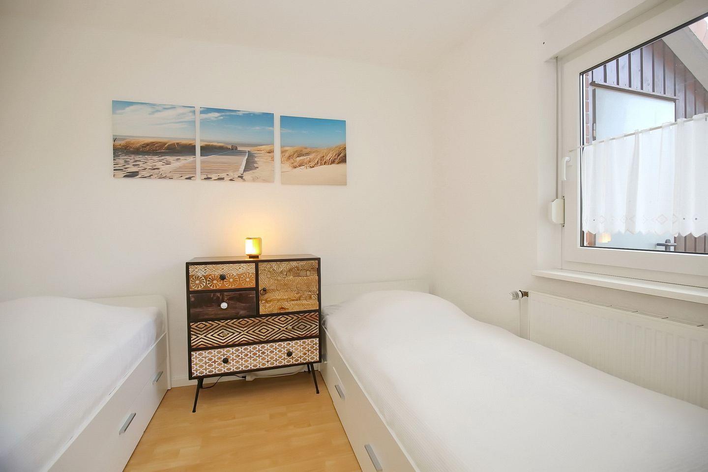 Zwei Einzelbetten (90 x 200 cm) bzw. ein großes Doppelbett (2 x 90 x 200 cm) findest du in den Schlafzimmern vor. Ein geräumiger Kleiderschrank im Obergeschoss bietet reichlich Platz für deine Urlaubsgarderobe. Ein Kinderhochstuhl und ein Kinderreisebett sind vorhanden.