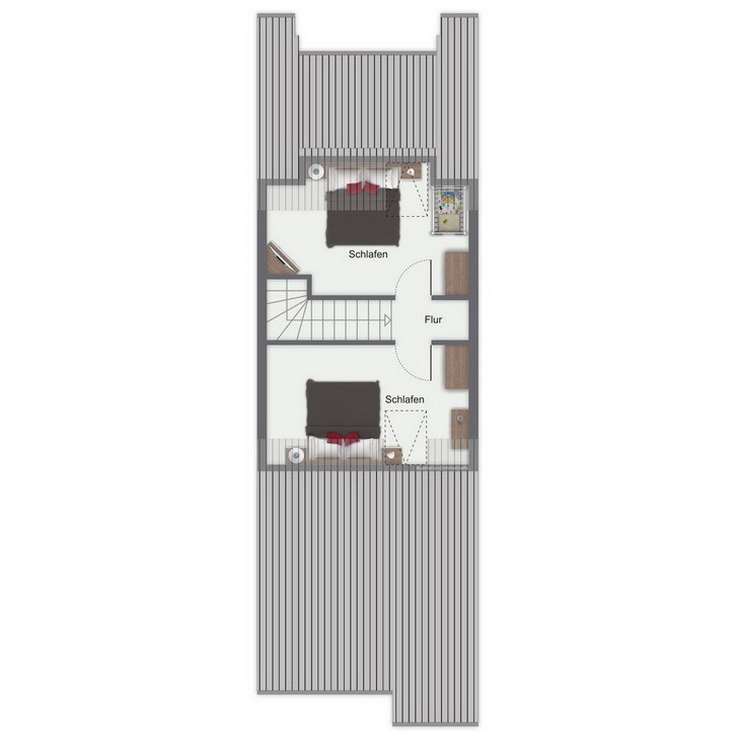 Im unteren Wohnbereich liegt ein Schlafzimmer mit zwei Einzelbetten (90 x 200 cm) und einem Kleiderschrank. Über die innenliegende Treppe kommst du in die Schlafzimmer im Dachgeschoss. Diese sind jeweils mit einem Doppelbett (2 x 90 x 200 cm) ausgestattet. Ein Schlafraum hat zusätzlich einen TV sowie eine Musikanlage. Die Fenster in allen Schlafzimmern können abgedunkelt werden.