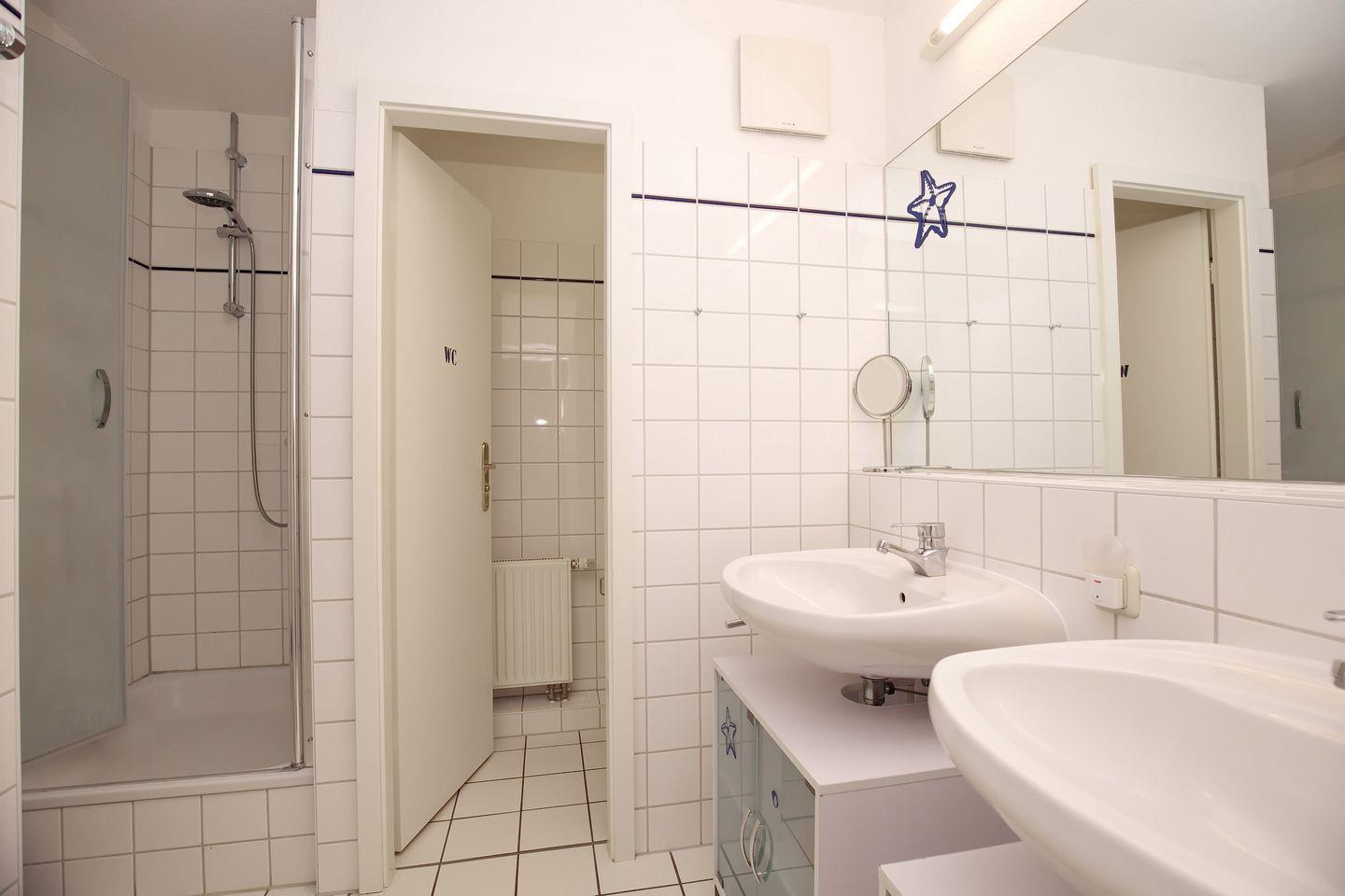 Im großen Duschbad mit zwei Waschbecken gibt es ein separates WC. Zusätzlich steht dir ein Gäste-WC zur Verfügung. In der Ferienwohnung ist das Rauchen nicht gestattet. Ein Kinderhochstuhl und ein Kinderreisebett sind vorhanden. Weiterhin stehen ein Buggy und ein Bollerwagen (ohne Gewähr) zur Verfügung.