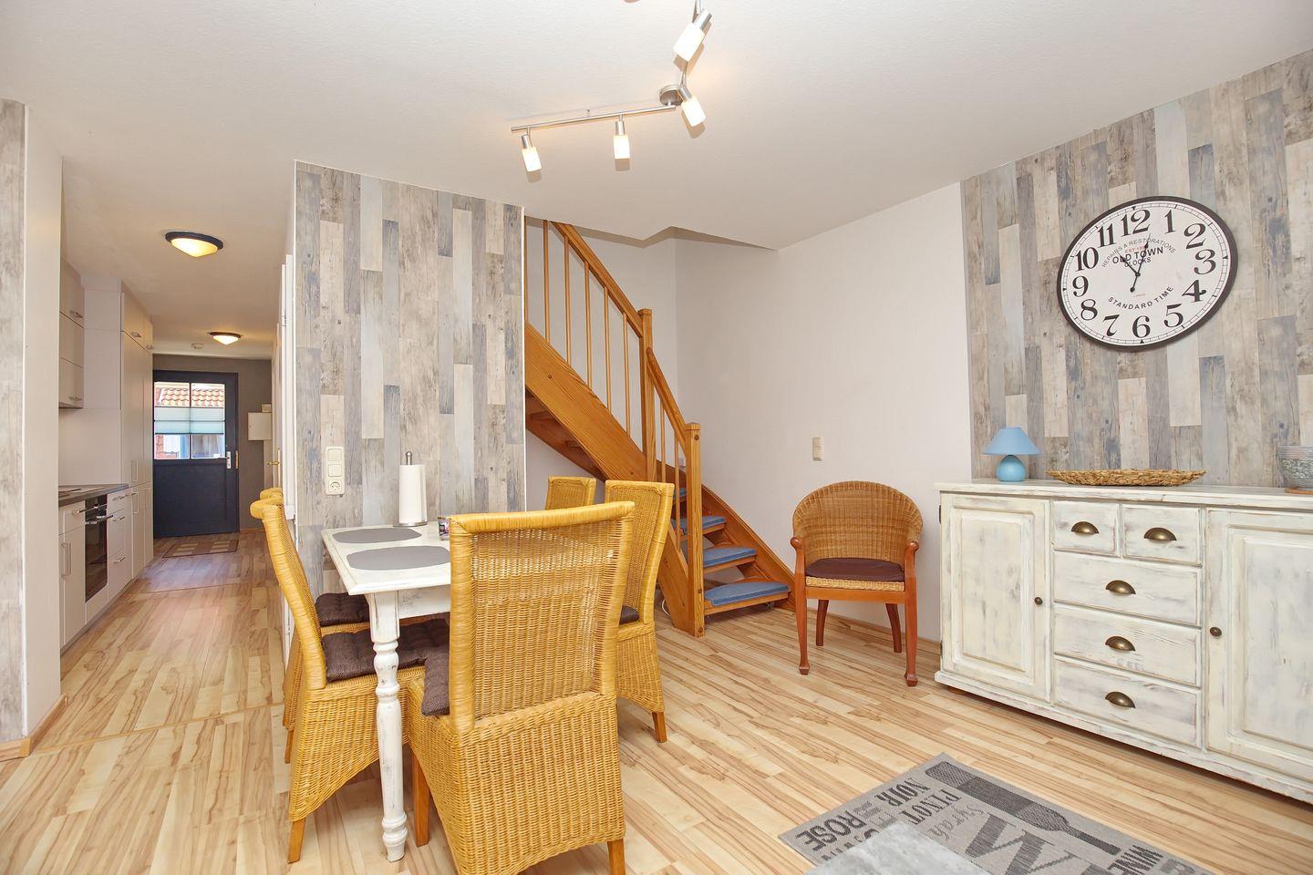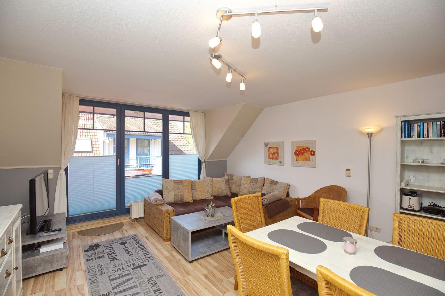 Im Wohnzimmer kannst du es dir auf dem Sofa gemütlich machen. Der Flachbild-TV, DVD-Player und eine Auswahl an Büchern, Spielen und DVDs sorgen für Abwechslung. Netflix via Firestick kann ebenfalls (ohne Gewähr) genutzt werden. Eine Spielekonsole (ohne Gewähr) sorgt für Spielspaß mit der ganzen Familie. Am Esstisch finden sechs Personen Platz. Über das Wohnzimmer aus gelangst du zum möblierten Balkon.