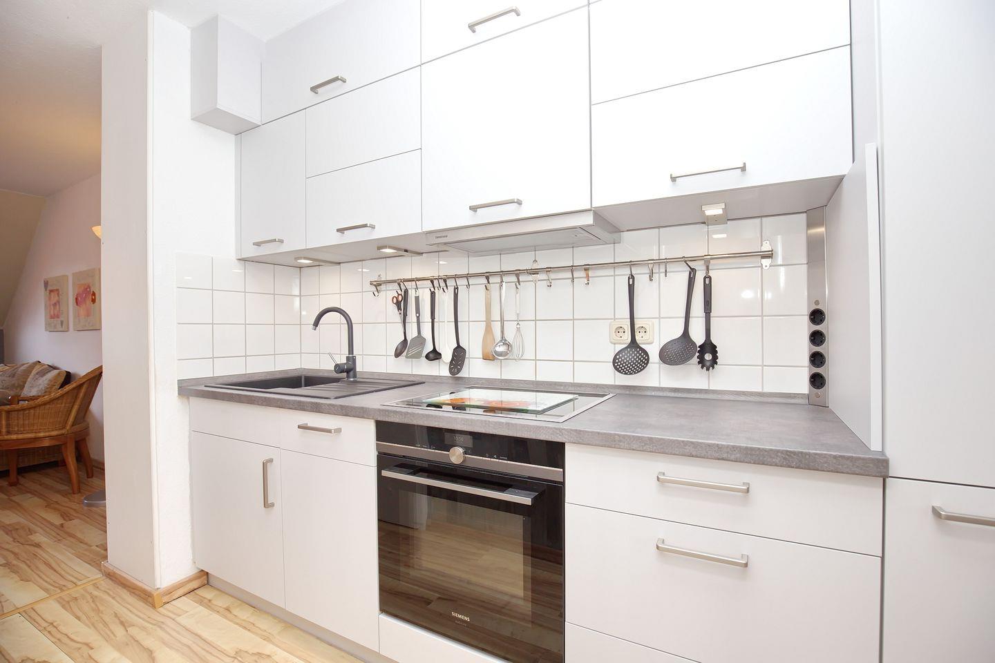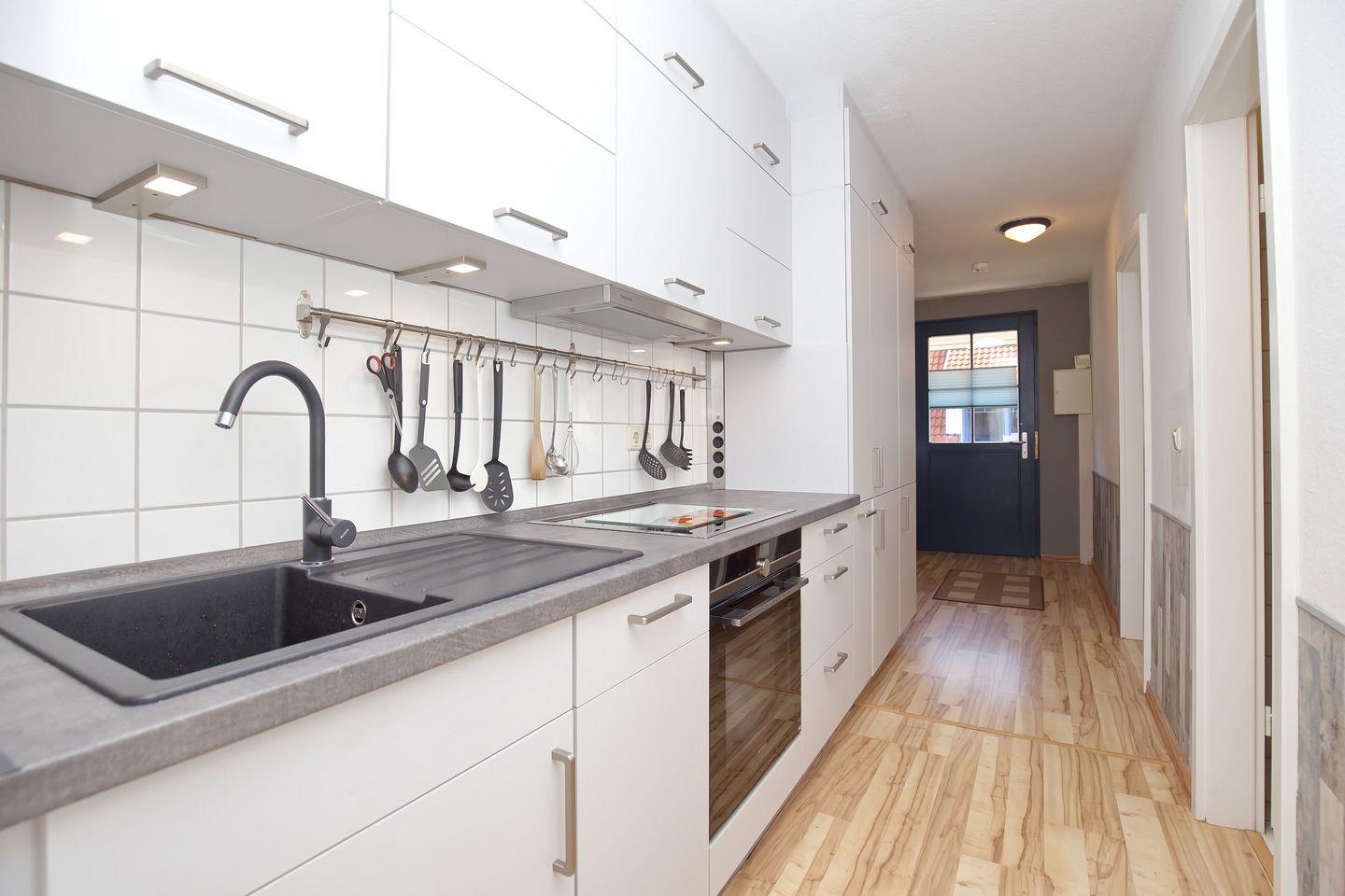 Ein Geschirrspüler, ein 4-Platten-Induktionskochfeld sowie ein Mikrowellen/Backofen-Kombigerät gehören ebenso zur Ausstattung der Küchenzeile wie ein Kühlschrank und ein Gefrierschrank. Im gesamten Wohnbereich und im ersten Schlafzimmer wurde Laminat ausgelegt. In den zwei Schlafzimmern im oberen Bereich wurde Teppich als Bodenbelag gewählt.