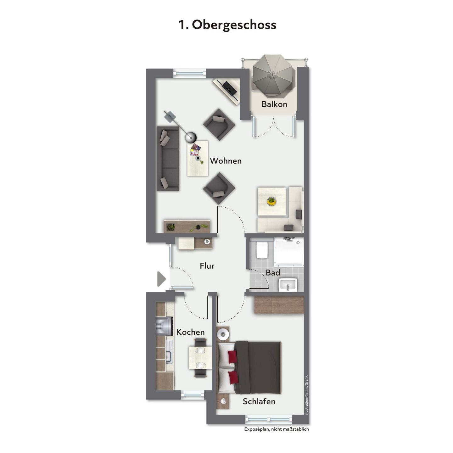 Dir stehen ein Wohnzimmer mit Essbereich, ein Schlafzimmer, eine separate Küche, ein Duschbad und ein Balkon in Süd-Ausrichtung zur Verfügung, den du vom Wohnbereich aus erreichst.
