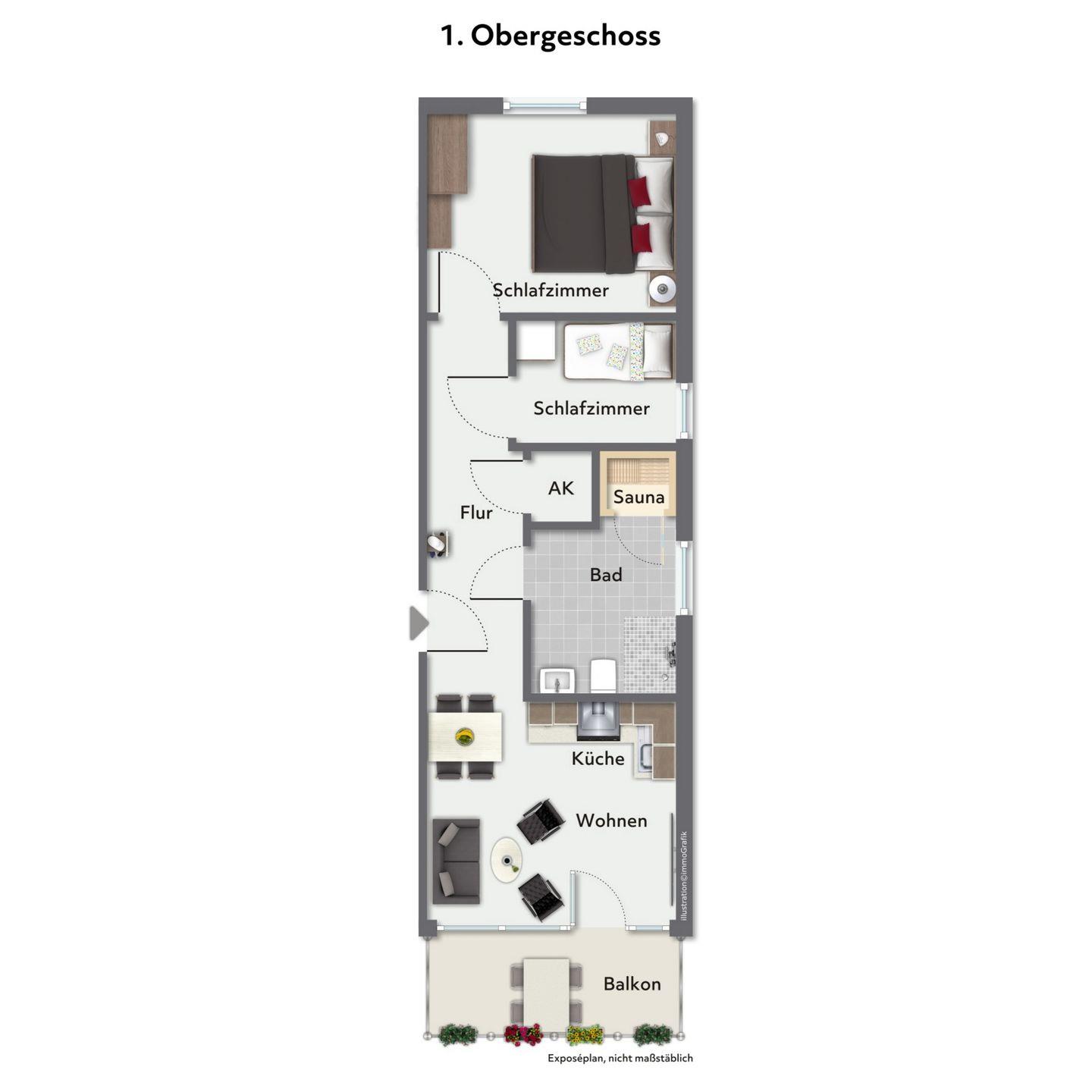 Die Ferienwohnung 04 im Haus 1 der Weißen Villen ist eine 3-Zimmer-Ferienwohnung im 1. Obergeschoss für maximal 4 Personen (2 Erwachsene + 2 Kinder).