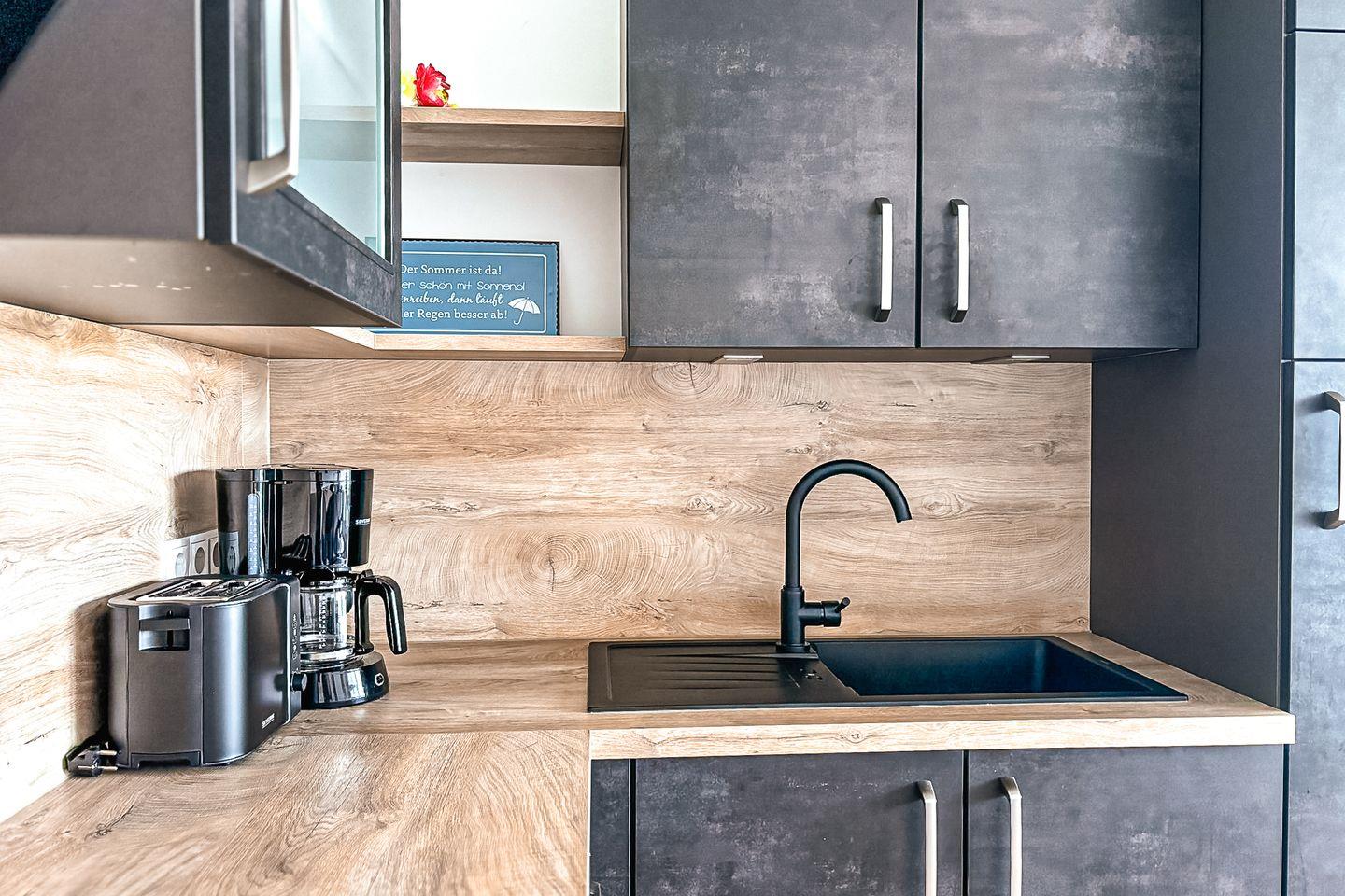 Die im Wohnzimmer integrierte Küche lässt keine Wünsche offen. Zur Zubereitung deiner Mahlzeiten ist alles vorhanden was du benötigst. Dazu zählen ein Herd mit einem 4-Platten-Cerankochfeld sowie einem Backofen, ein Kühlschrank mit Gefrierfach, eine Geschirrspülmaschine, ausreichend Geschirr, Besteck und Gläser.